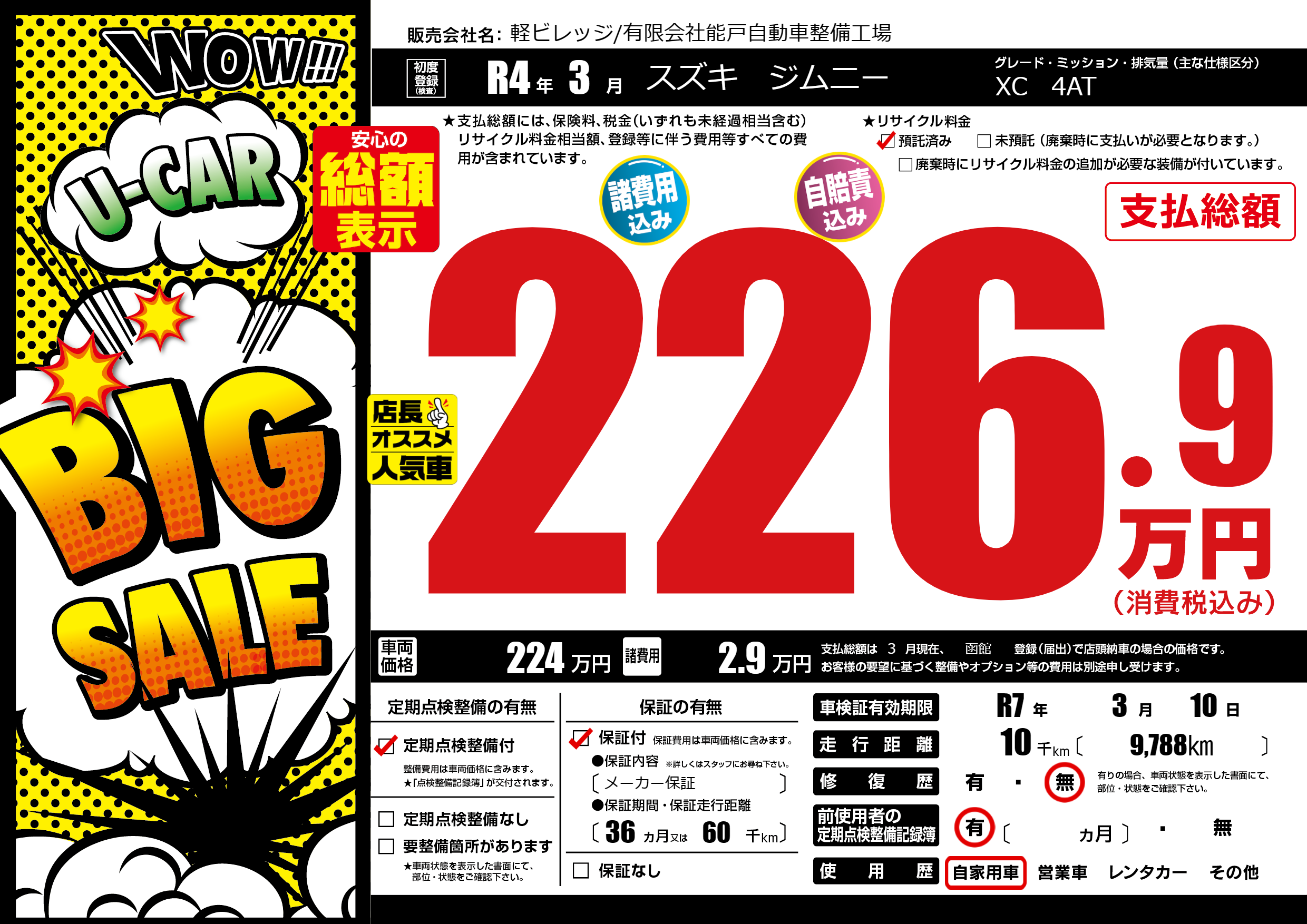 | 走行キロ | 1万km | 初年度登録 | R4年3月 |