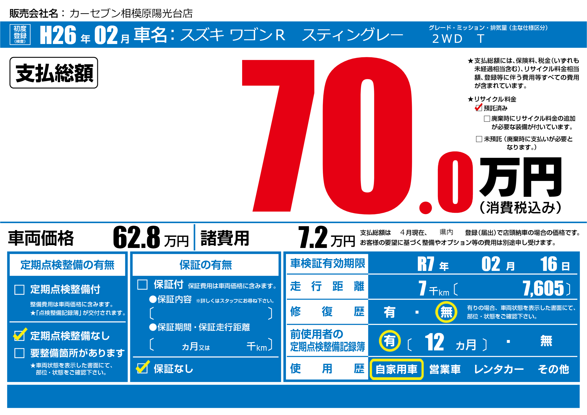 | 走行キロ | 0.7万km | 初年度登録 | H26年02月 |