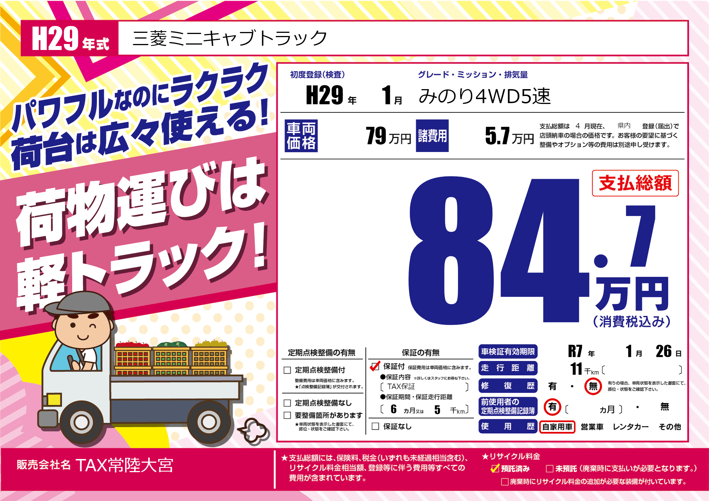 | 車名 | 三菱ミニキャブトラック | グレード ミッション 排気量 |