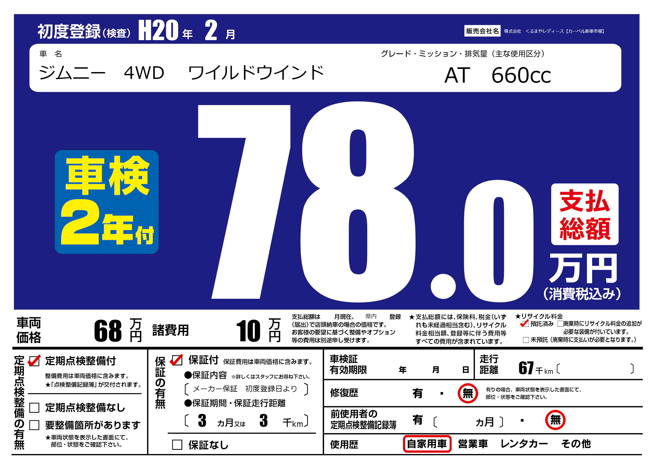 | 走行キロ | 6.7万km | 初年度登録 | H20年2月 |