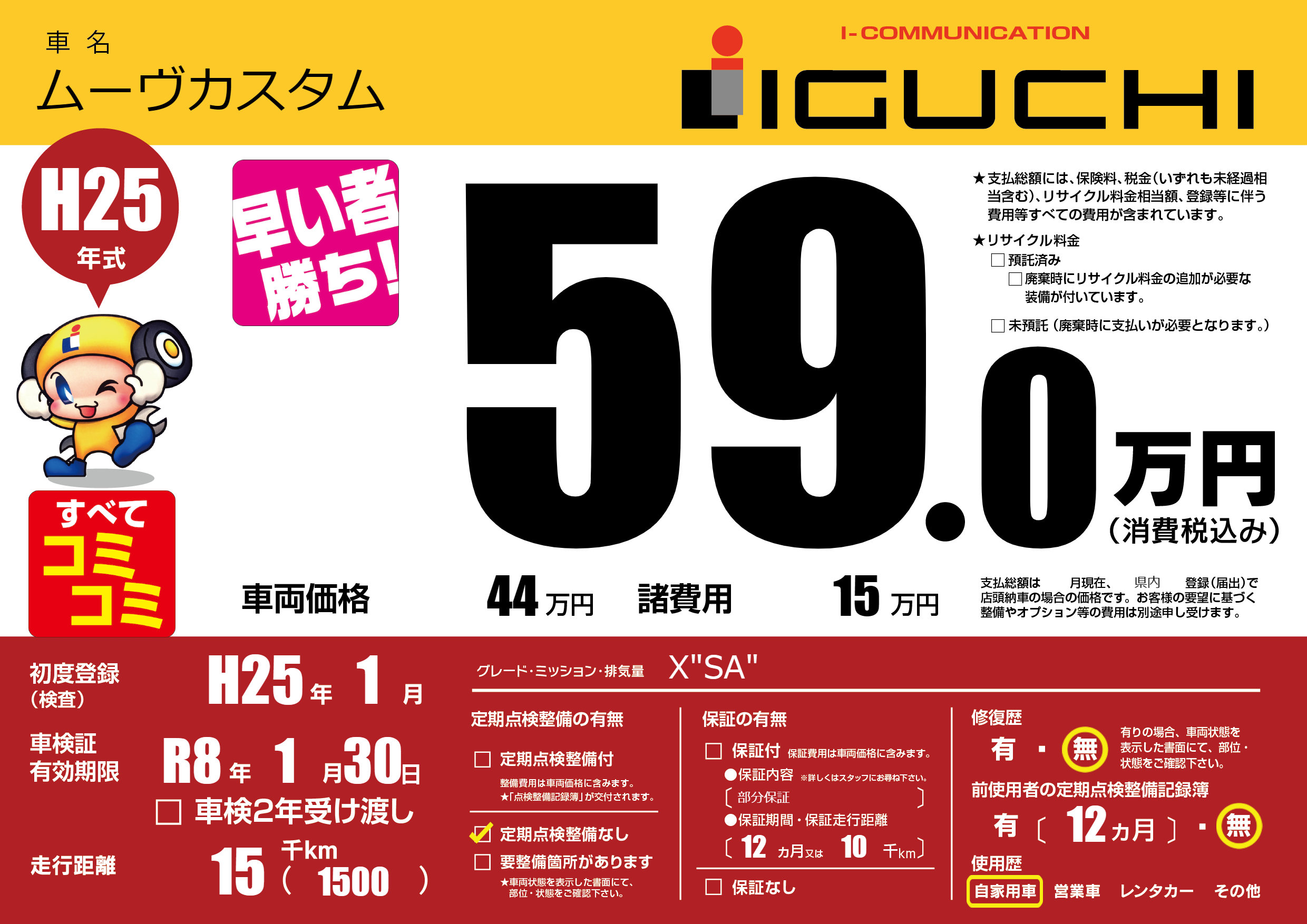 | 走行キロ | 1.5万km | 初年度登録 | H25年1月 |