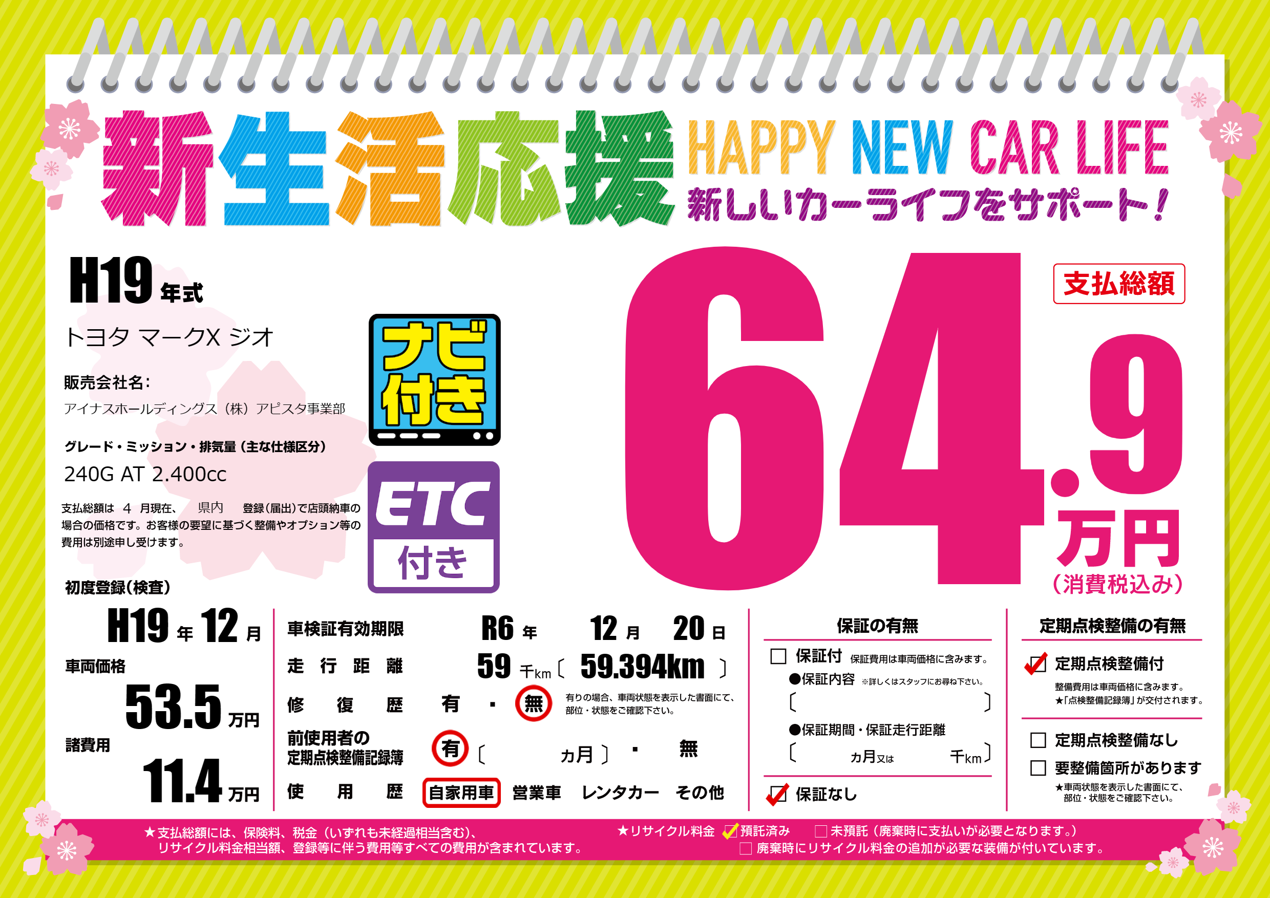| 車名 | トヨタ マークX ジオ | グレード ミッション 排気量 |