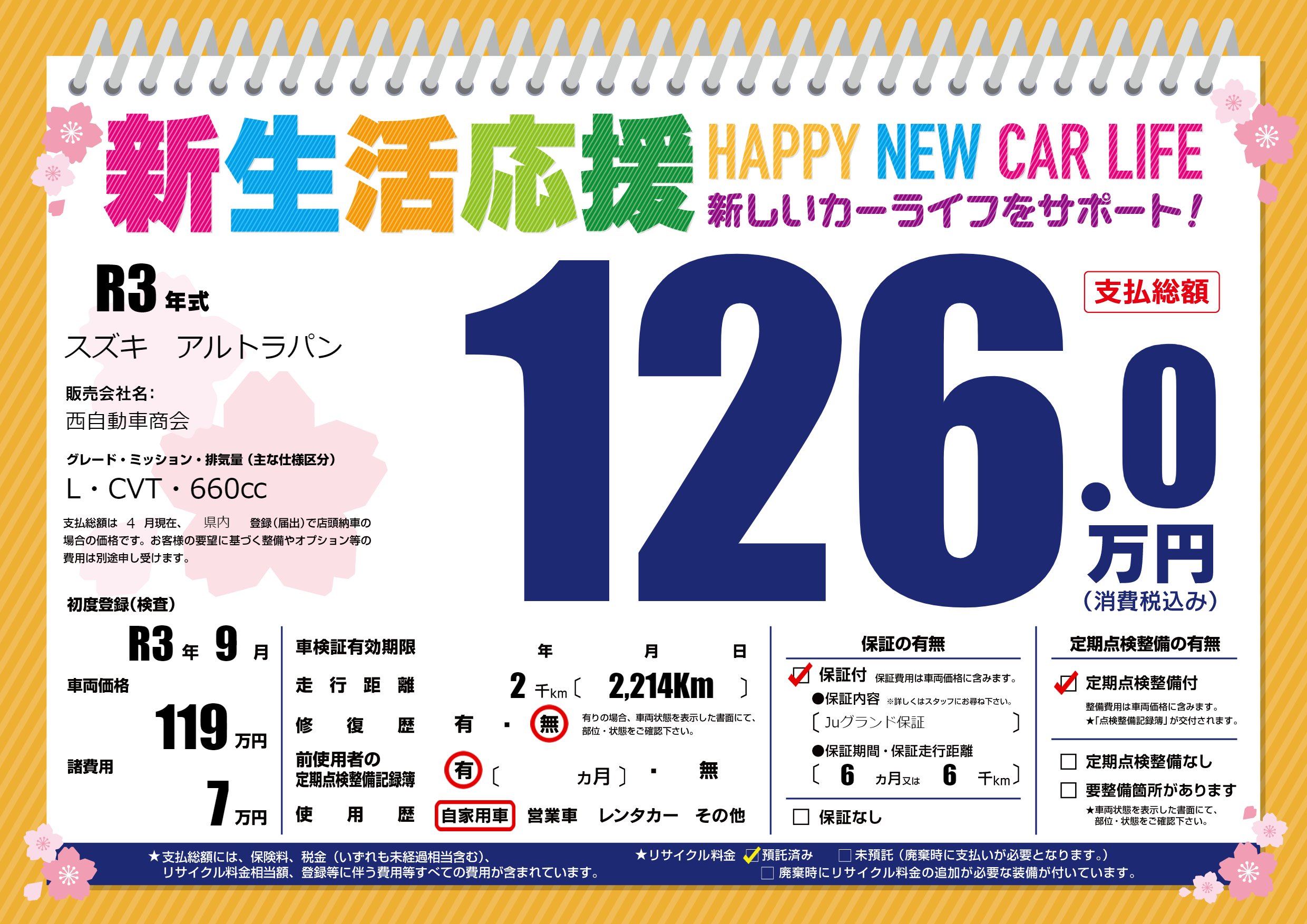 | 走行キロ | 0.2万km | 初年度登録 | R3年9月 |