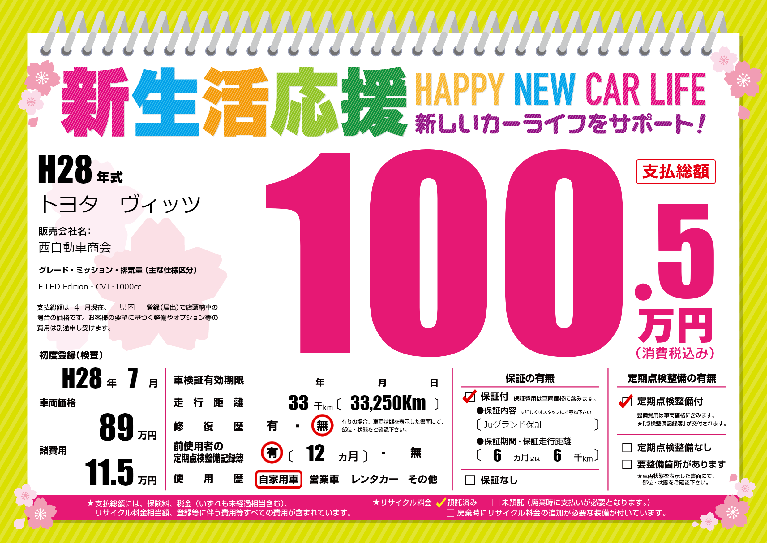 | 車名 | トヨタ ヴィッツ | グレード ミッション 排気量 |