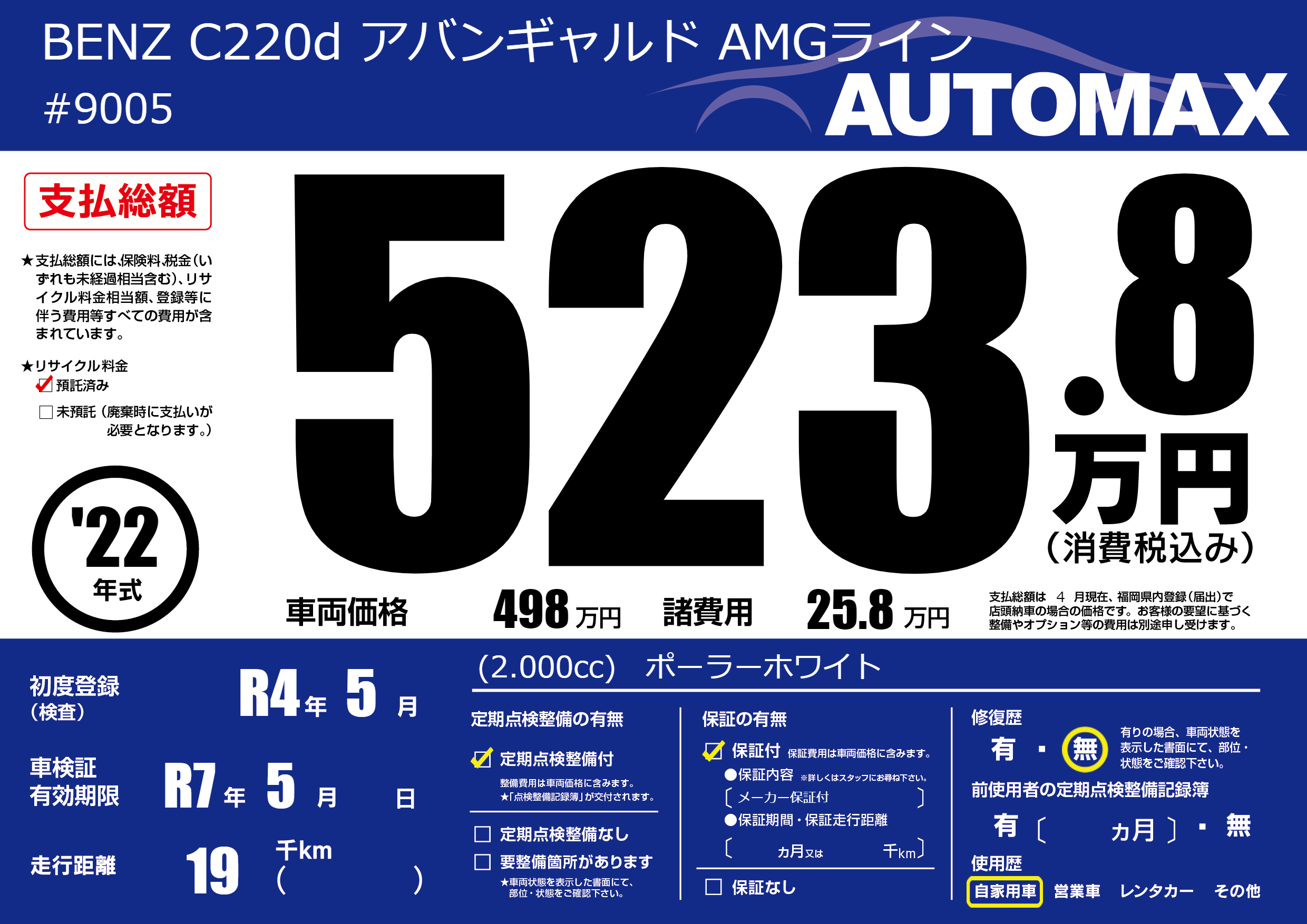 | 車名 | BENZ C220d アバンギャルド AMGライン | グレード ミッション 排気量 |