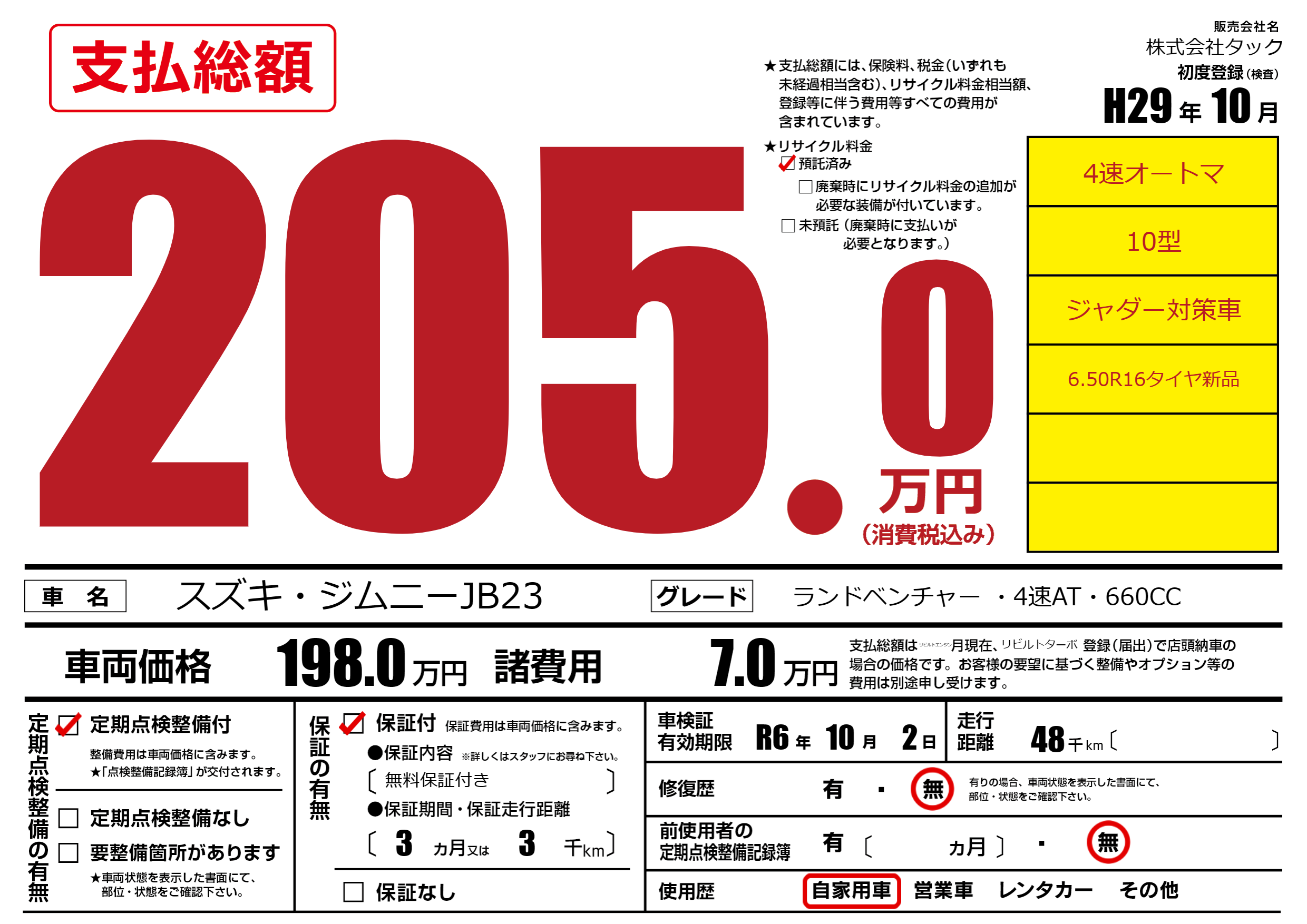 | 車名 | スズキ・ジムニーJB23 | グレード ミッション 排気量 |