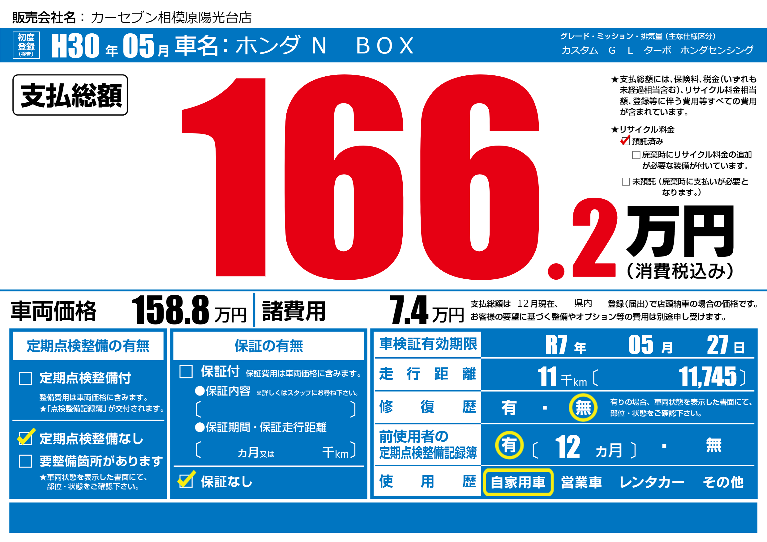 | 車名 | ホンダ N BOX | グレード ミッション 排気量 |