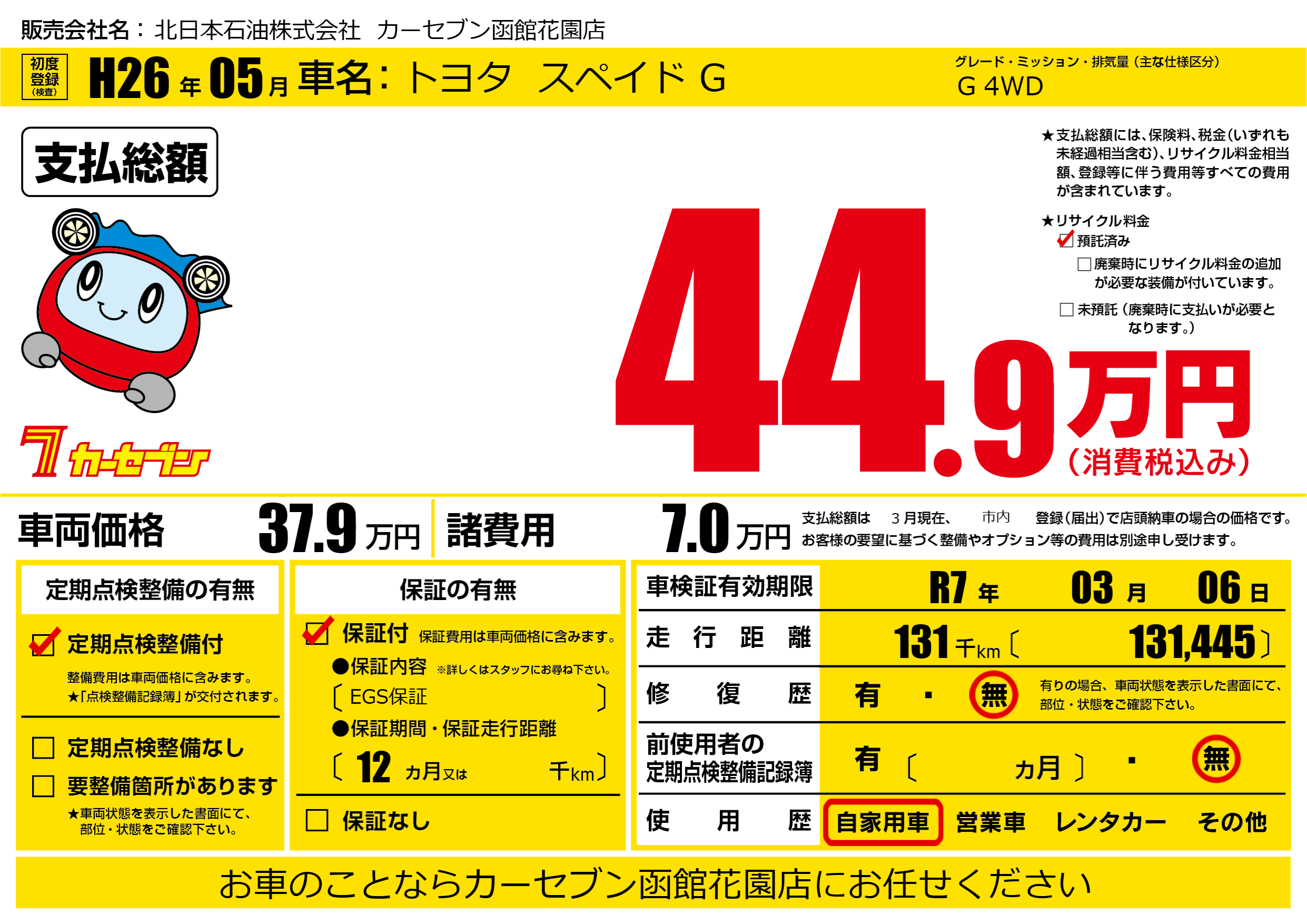 | 車名 | トヨタ スペイド G | グレード ミッション 排気量 |