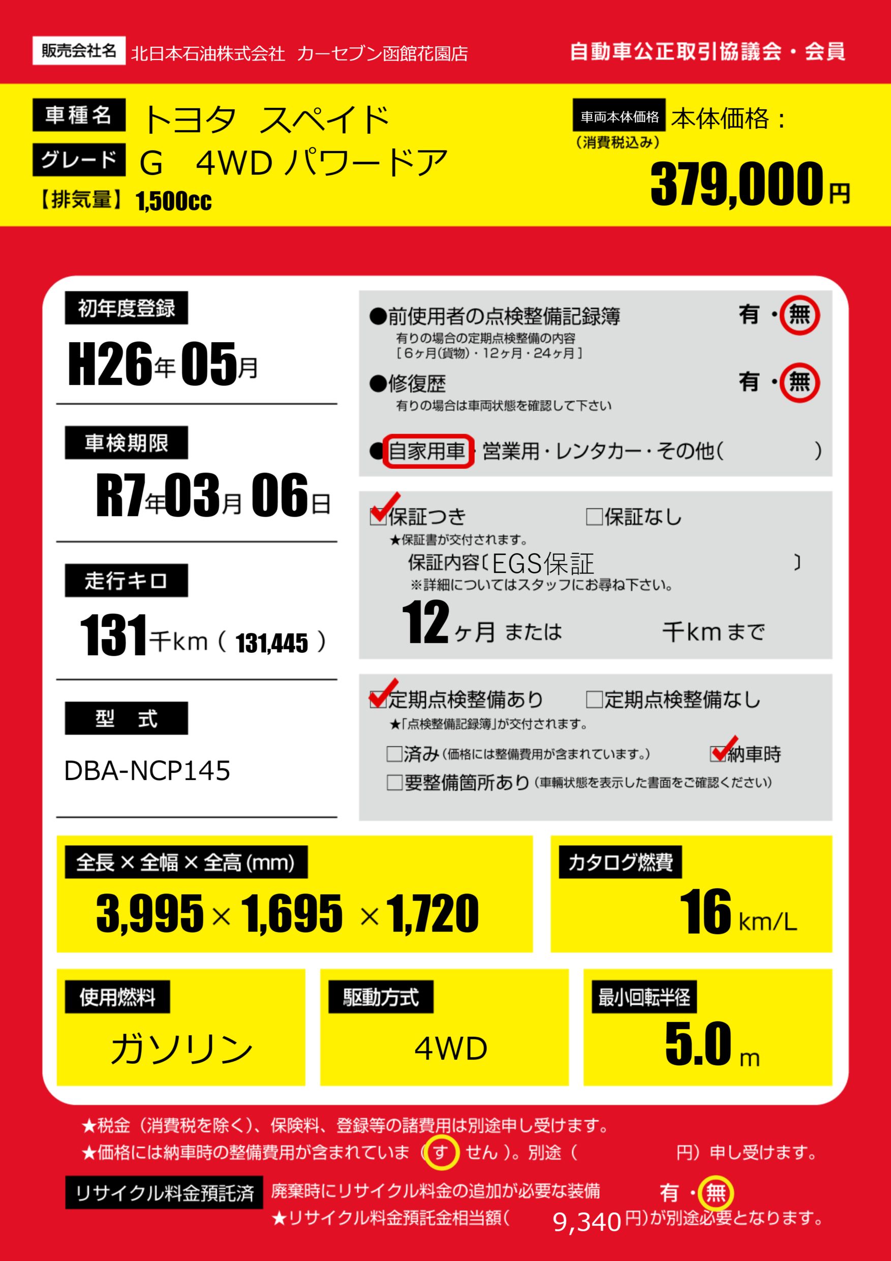 | 車名 | トヨタ スペイド | グレード ミッション 排気量 |