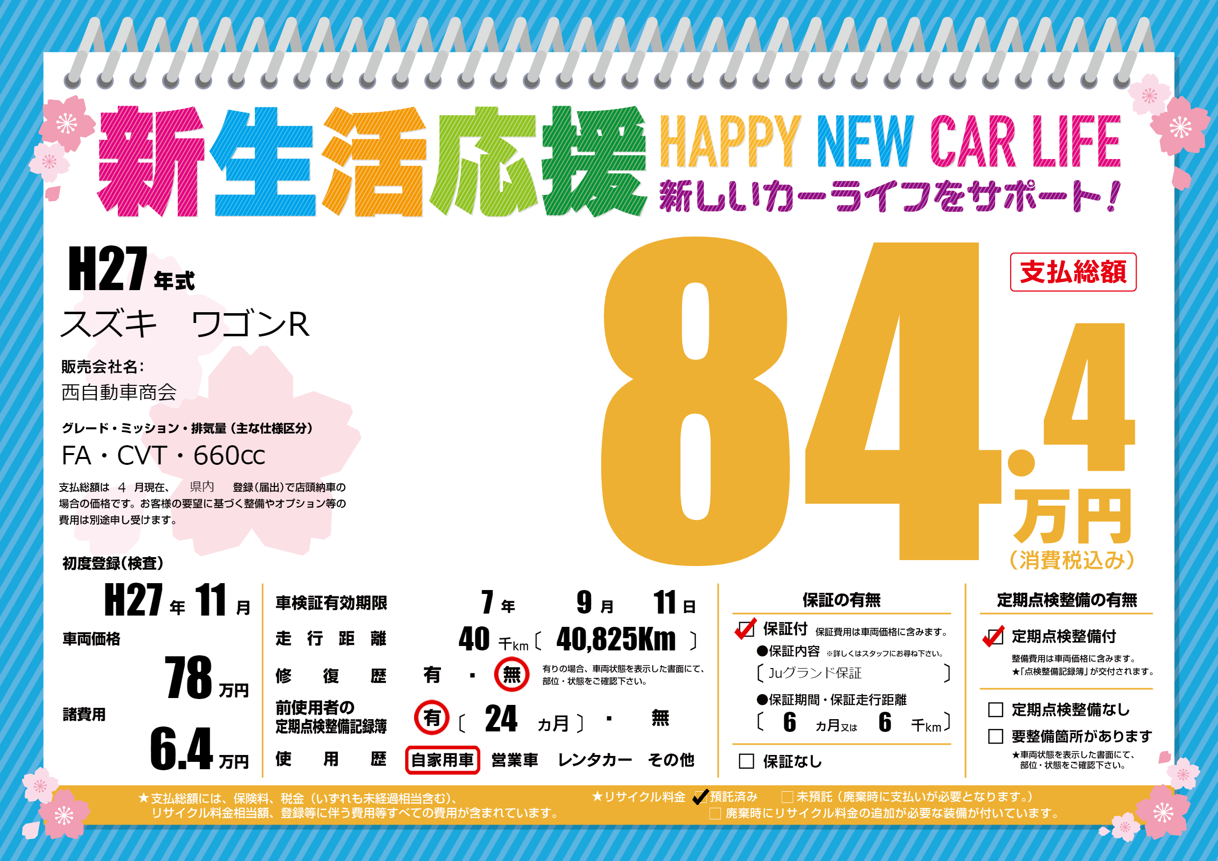 | 走行キロ | 4万km | 初年度登録 | H27年11月 |