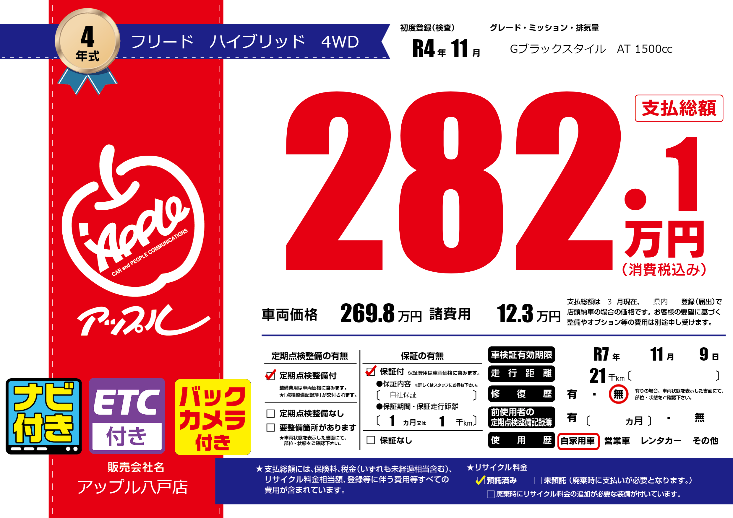 | 車名 | フリード ハイブリッド 4WD | グレード ミッション 排気量 |