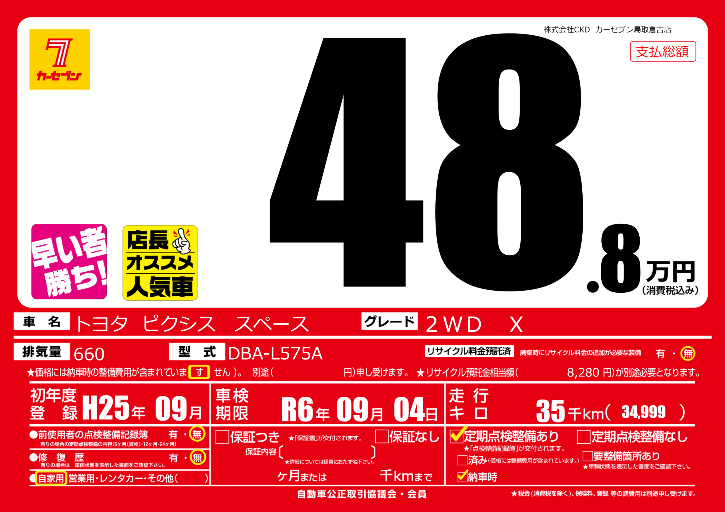 | 走行キロ | 3.5万km | 初年度登録 | H25年09月 |