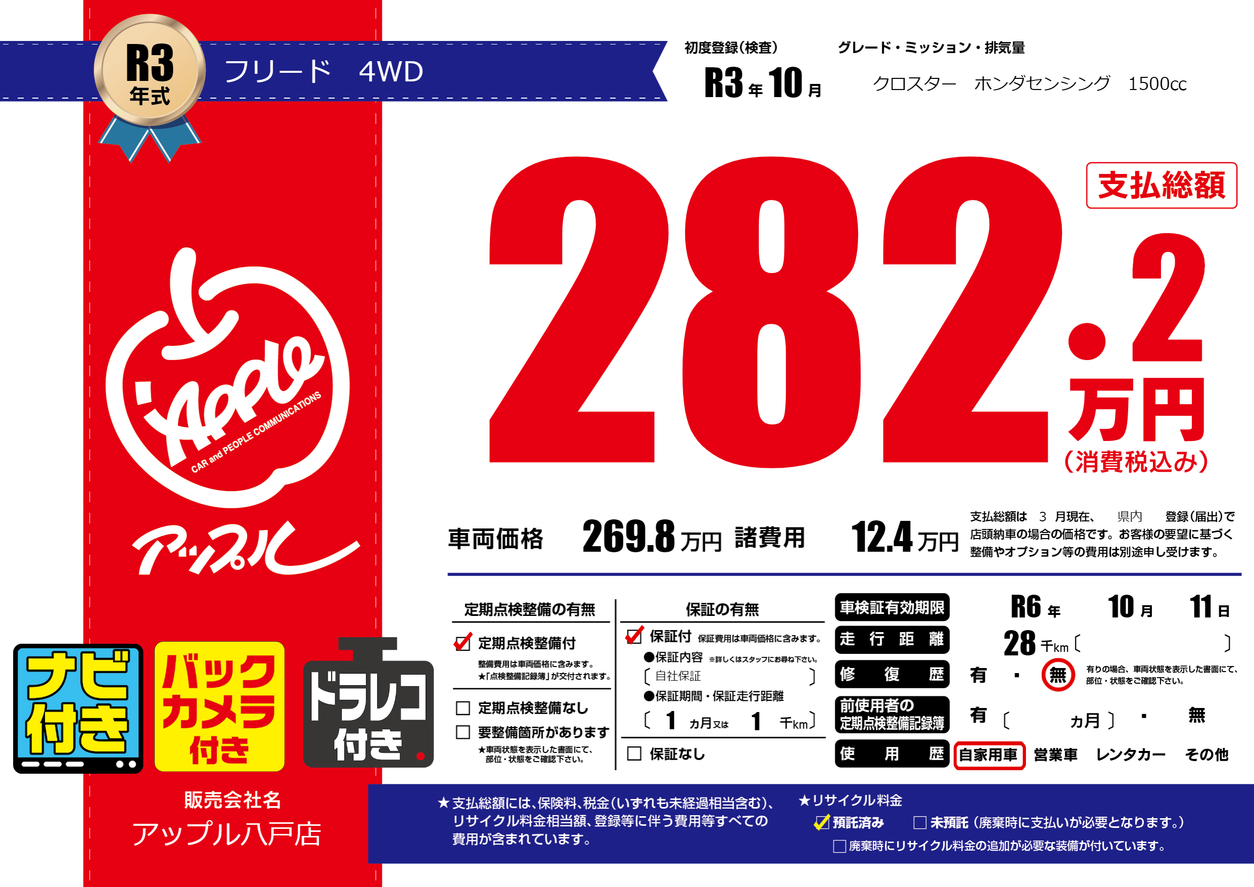 | 車名 | フリード 4WD | グレード ミッション 排気量 |