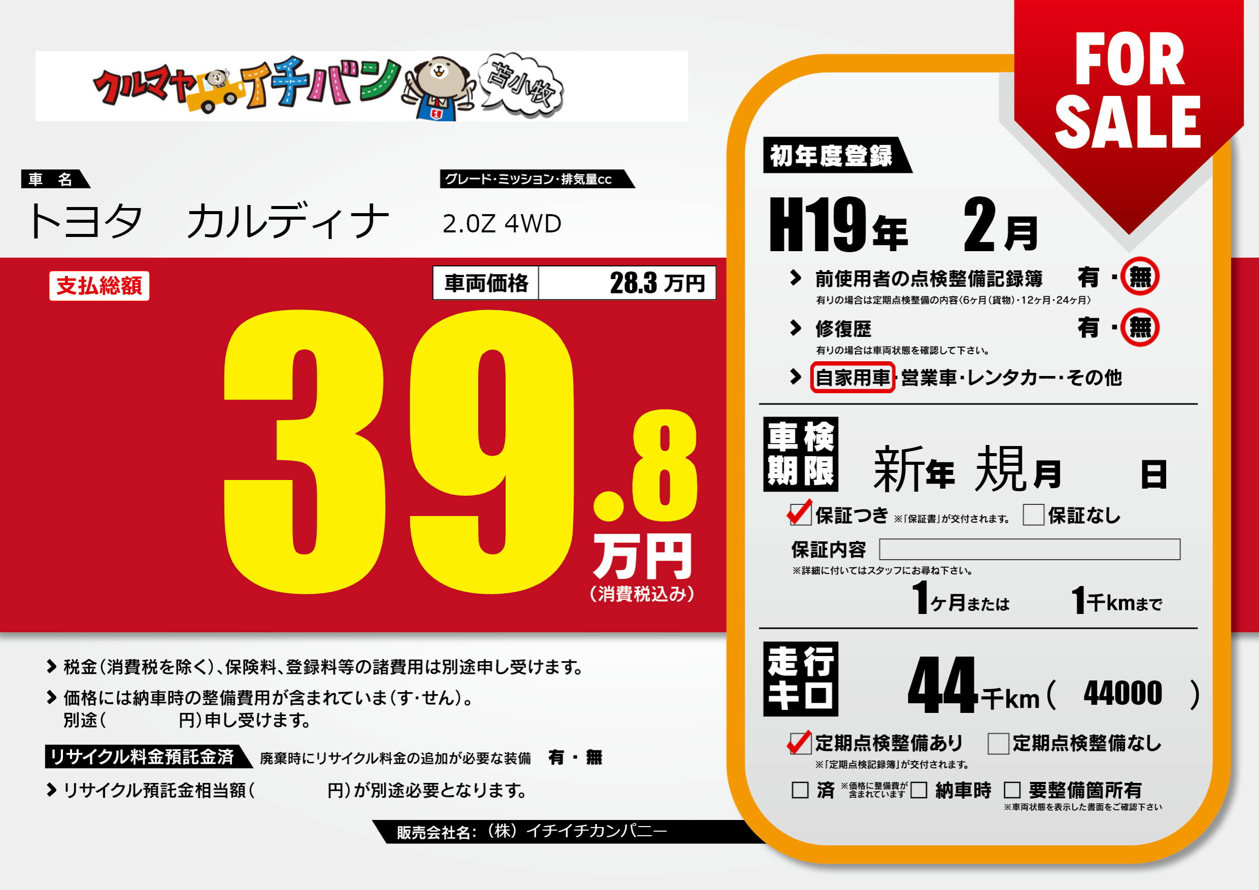 | 車名 | トヨタ カルディナ | グレード ミッション 排気量 |