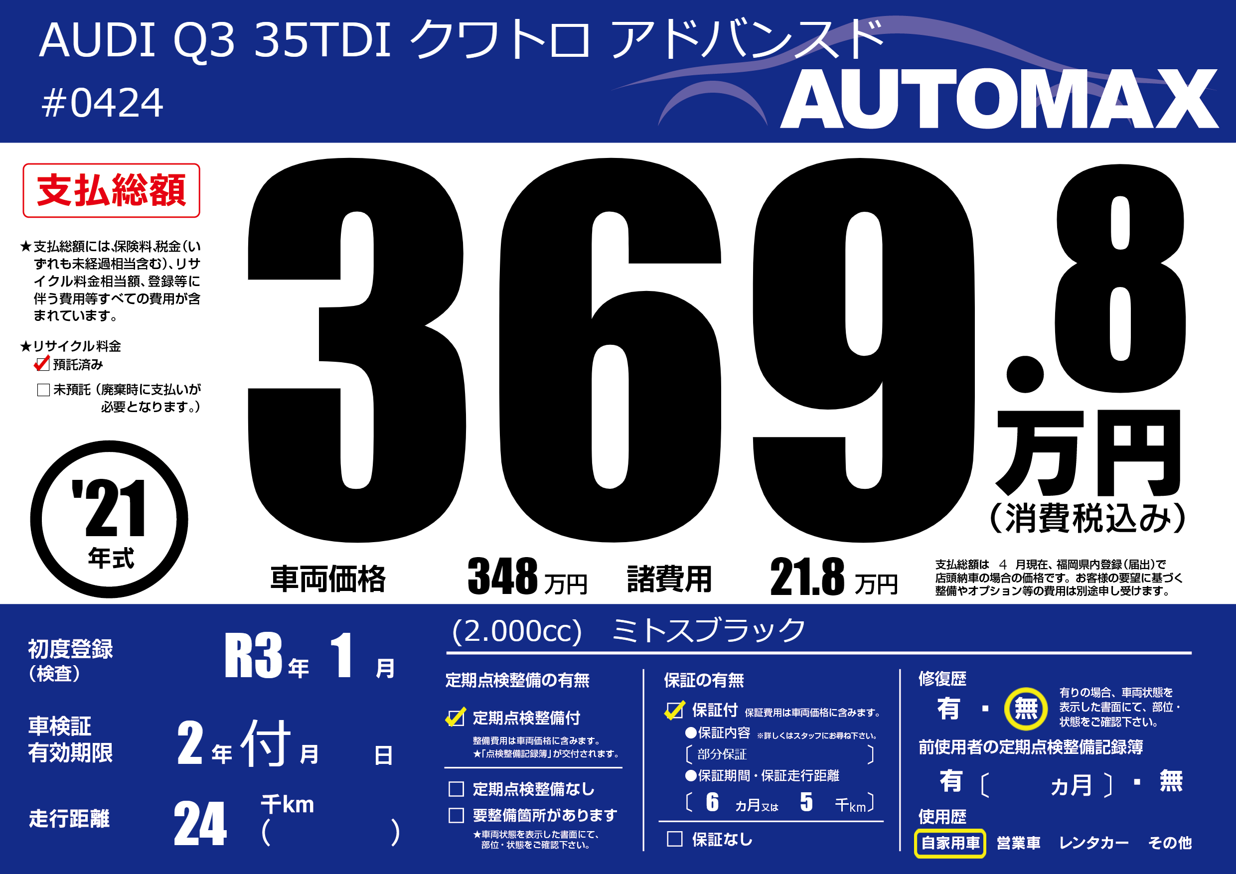 | 車名 | AUDI Q3 35TDI クワトロ アドバンスド | グレード ミッション 排気量 |