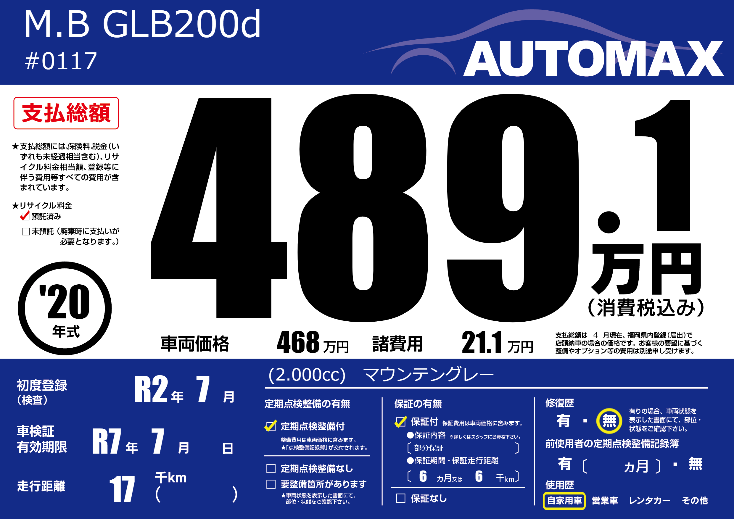 | 車検制限 | R7年 7月 - 日 | ||