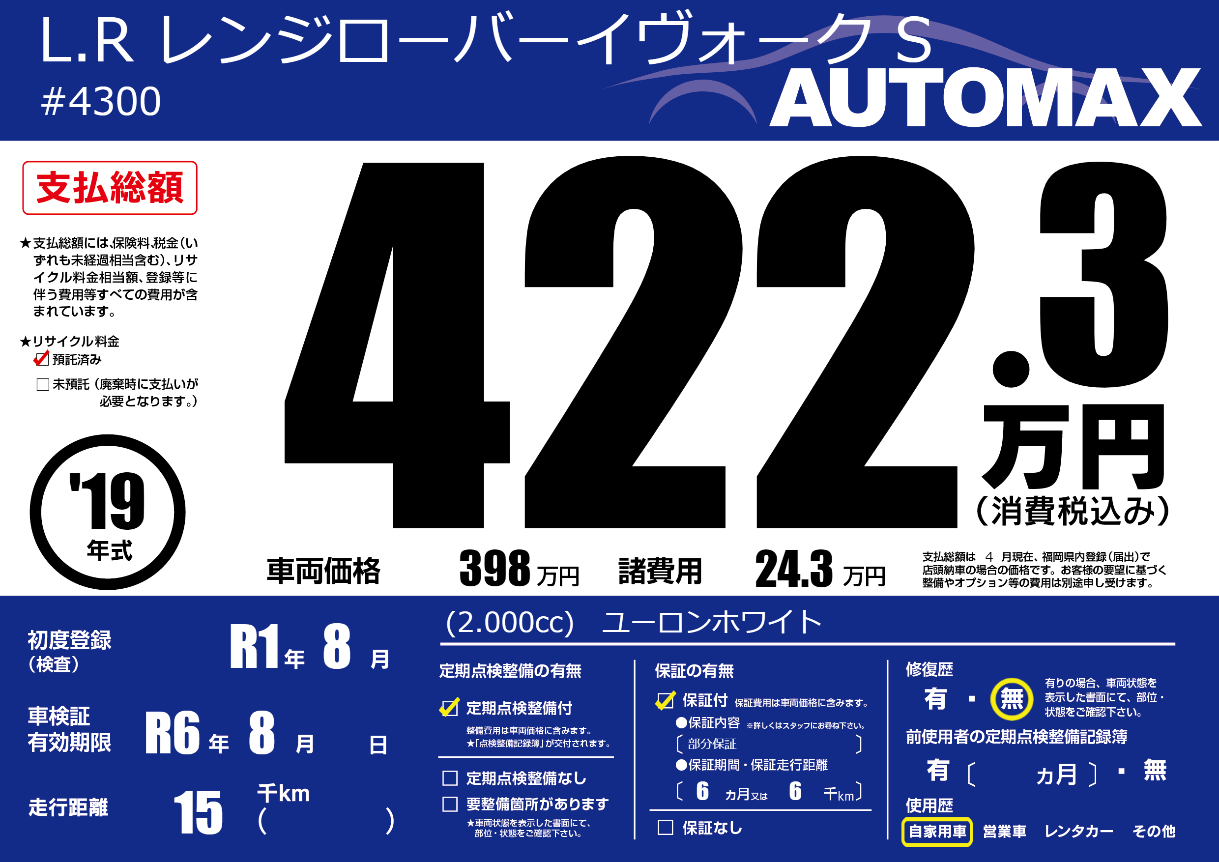 | 車名 | L.R レンジローバーイヴォーク S | グレード ミッション 排気量 |