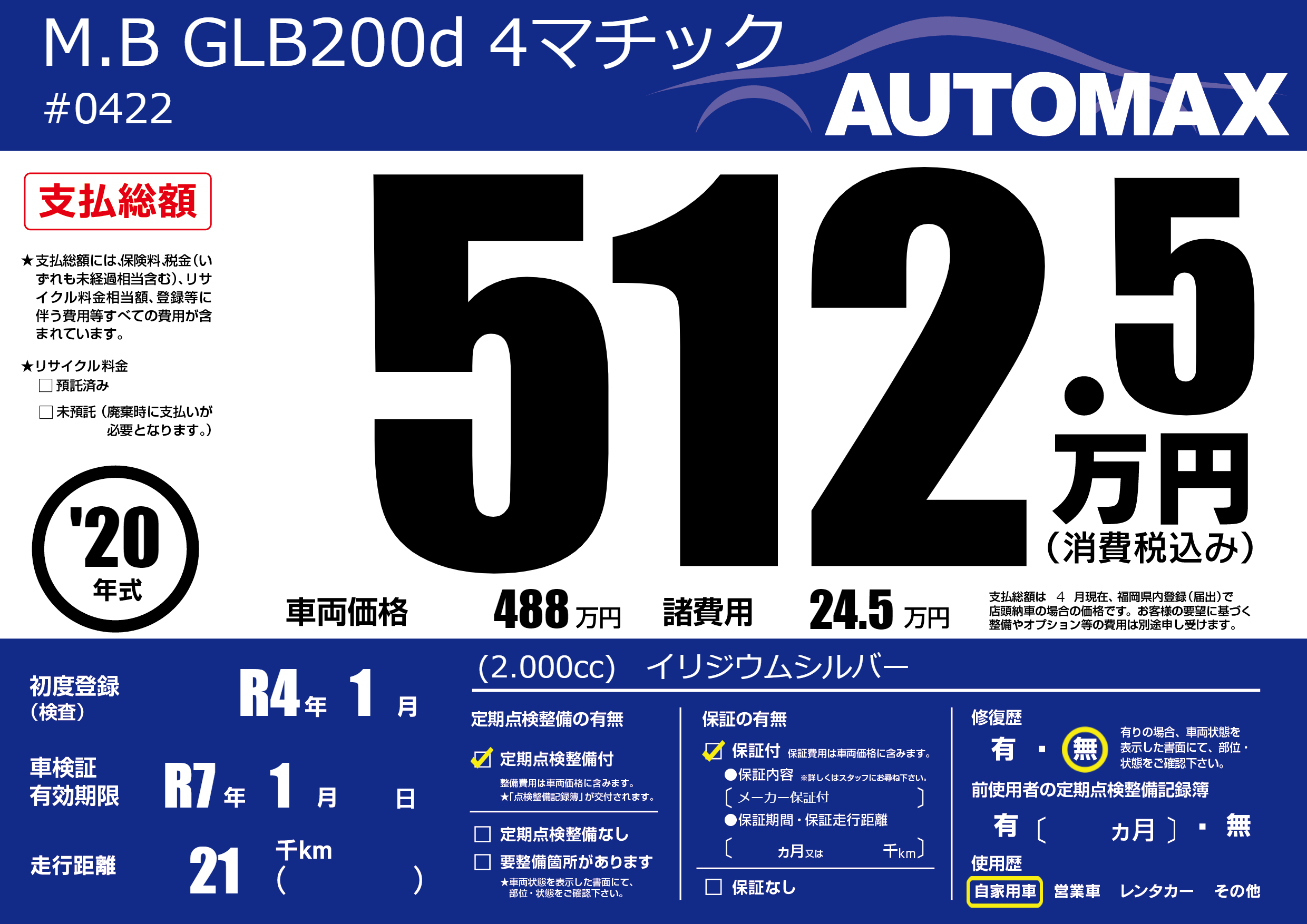 | 車名 | M.B GLB200d 4マチック | グレード ミッション 排気量 |