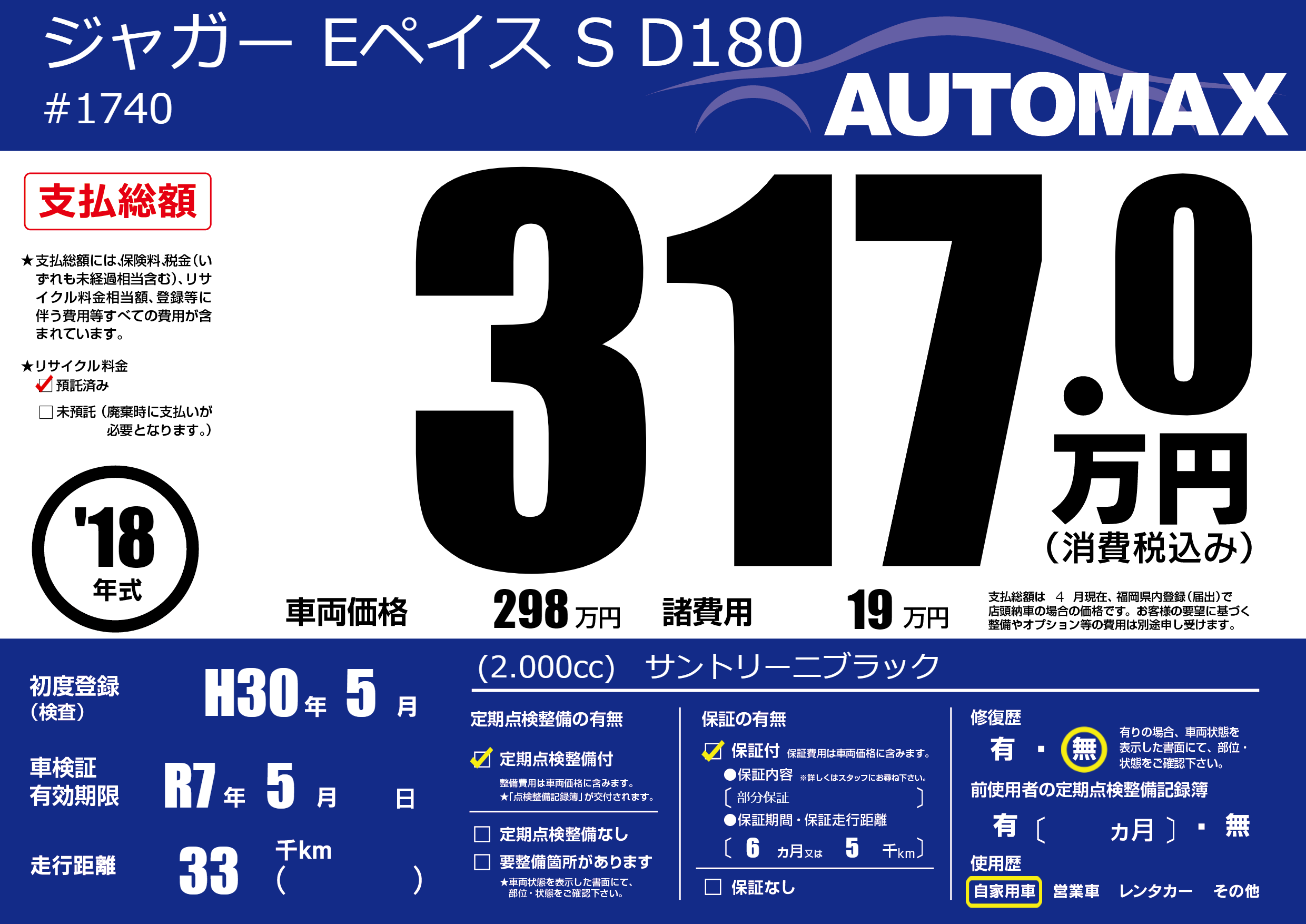 | 車名 | ジャガー Eペイス S D180 | グレード ミッション 排気量 |