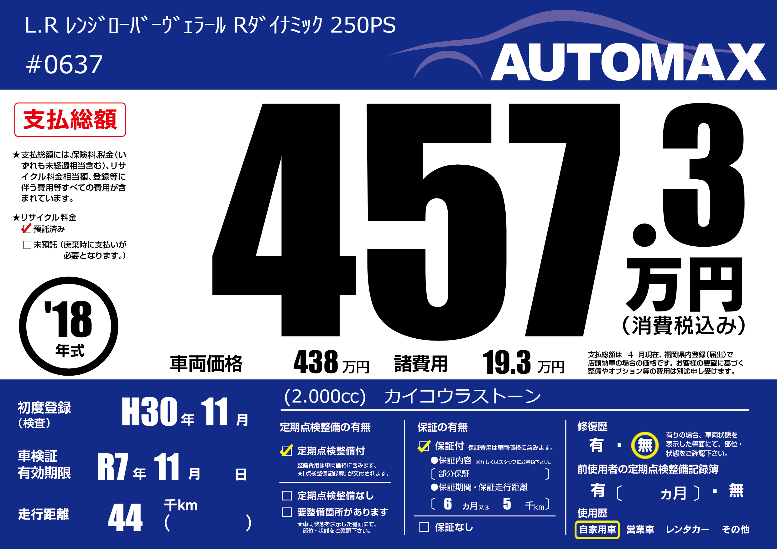 | 車名 | L.R レンジローバーヴェラール Rダイナミック 250PS | グレード ミッション 排気量 |