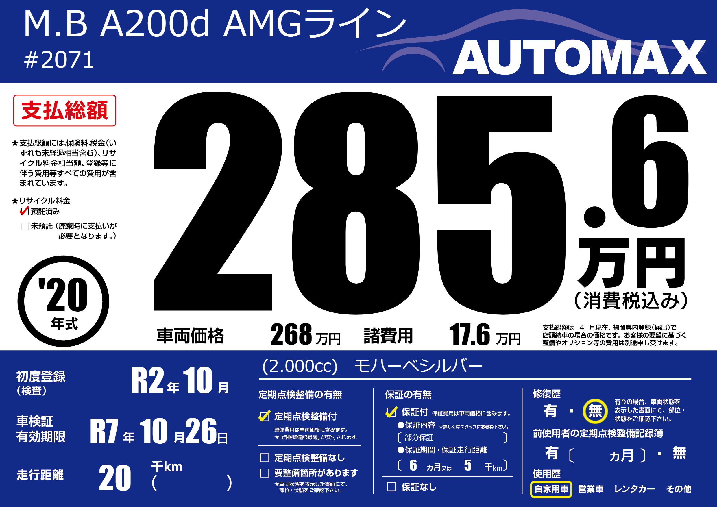 | 車名 | M.B A200d AMGライン | グレード ミッション 排気量 |