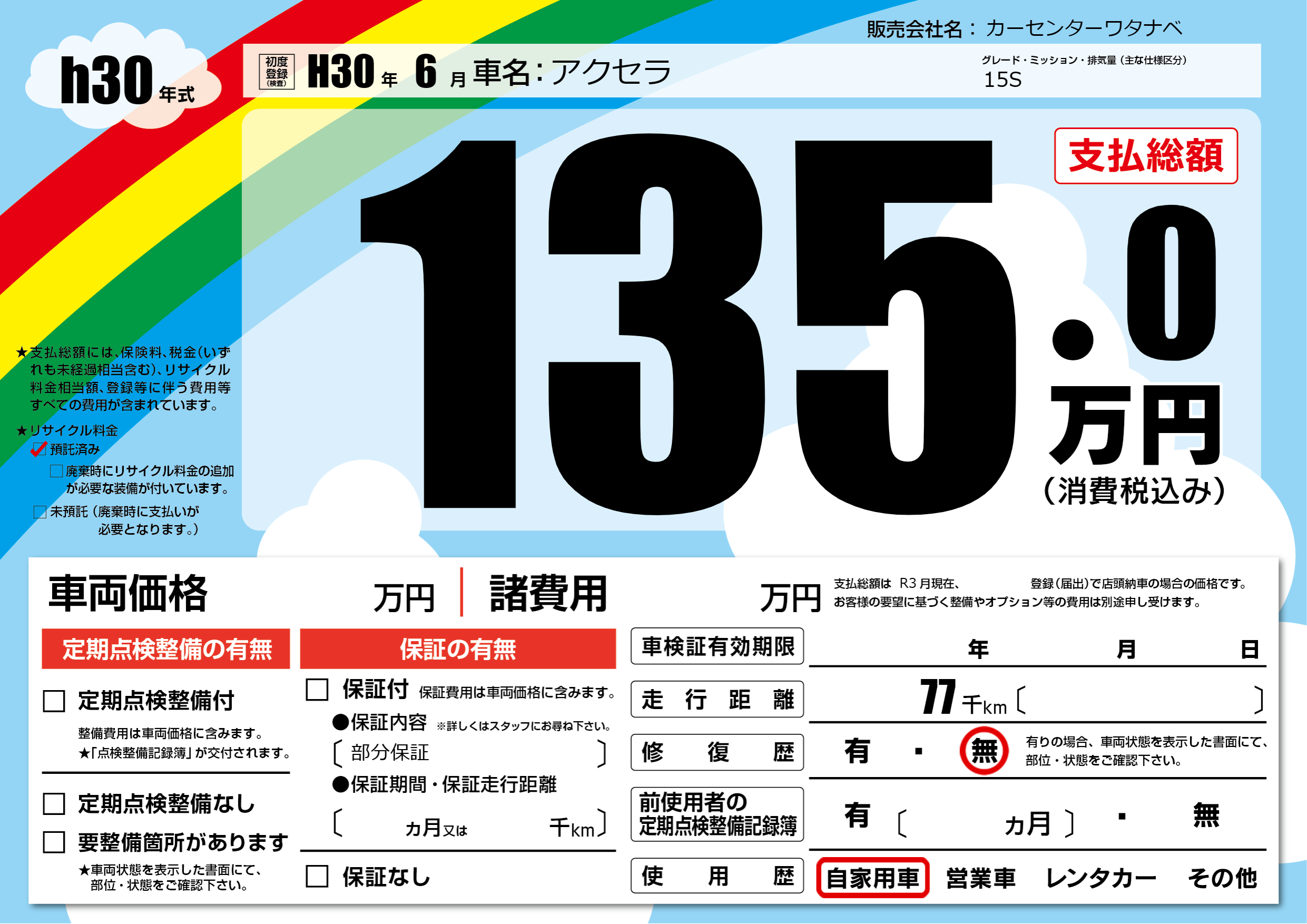 | 走行キロ | 7.7万km | 初年度登録 | H30年6月 |