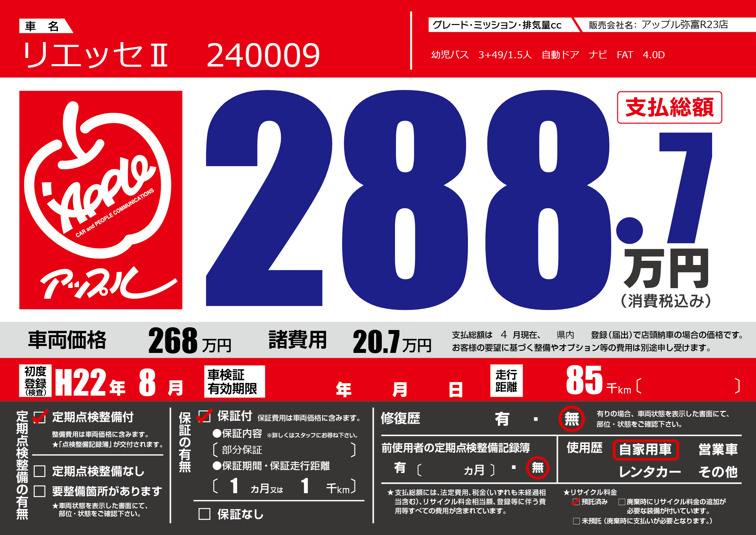 | 車名 | リエッセⅡ 240009 | グレード ミッション 排気量 |