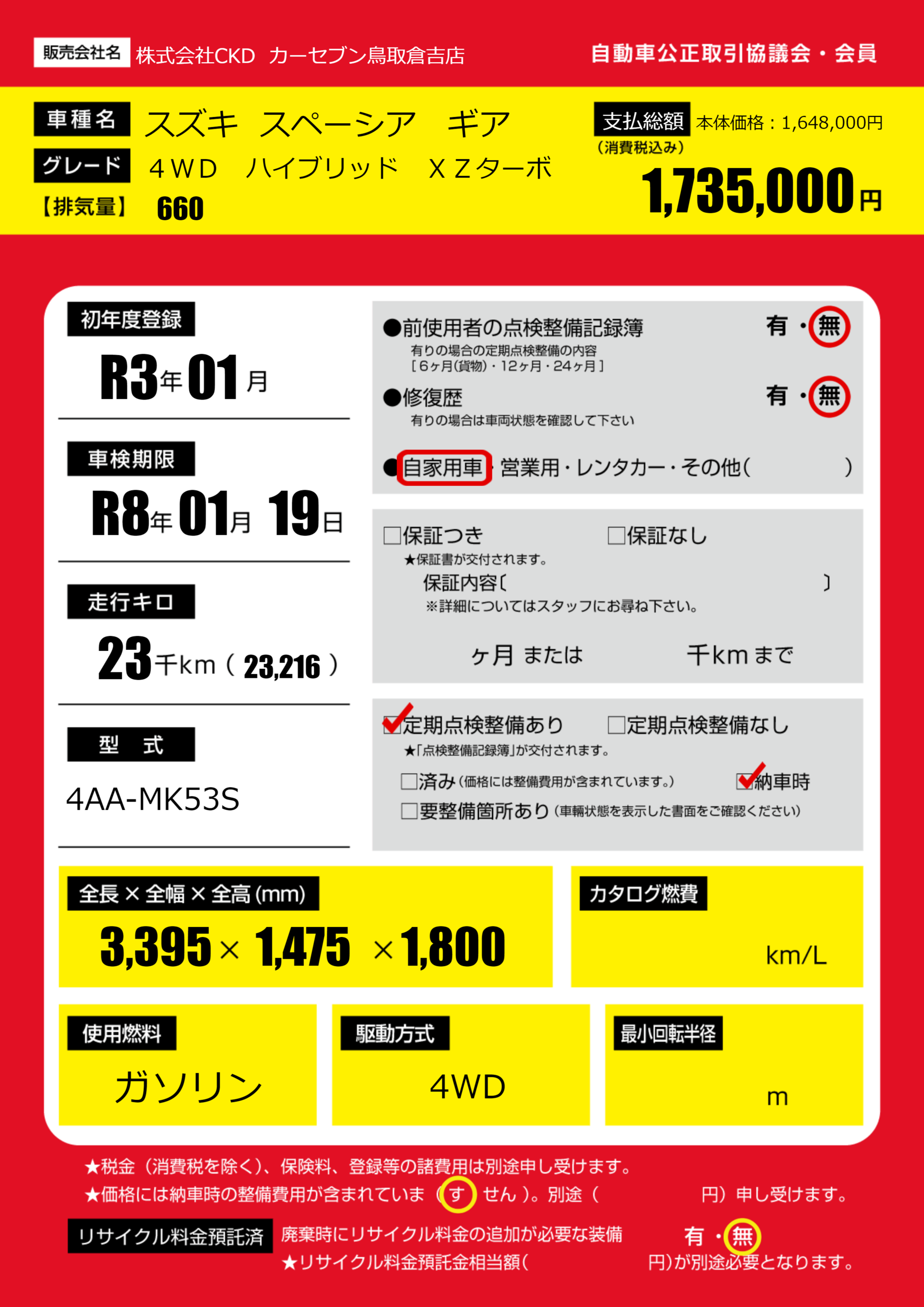 | 車名 | スズキ スペーシア ギア | グレード ミッション 排気量 |