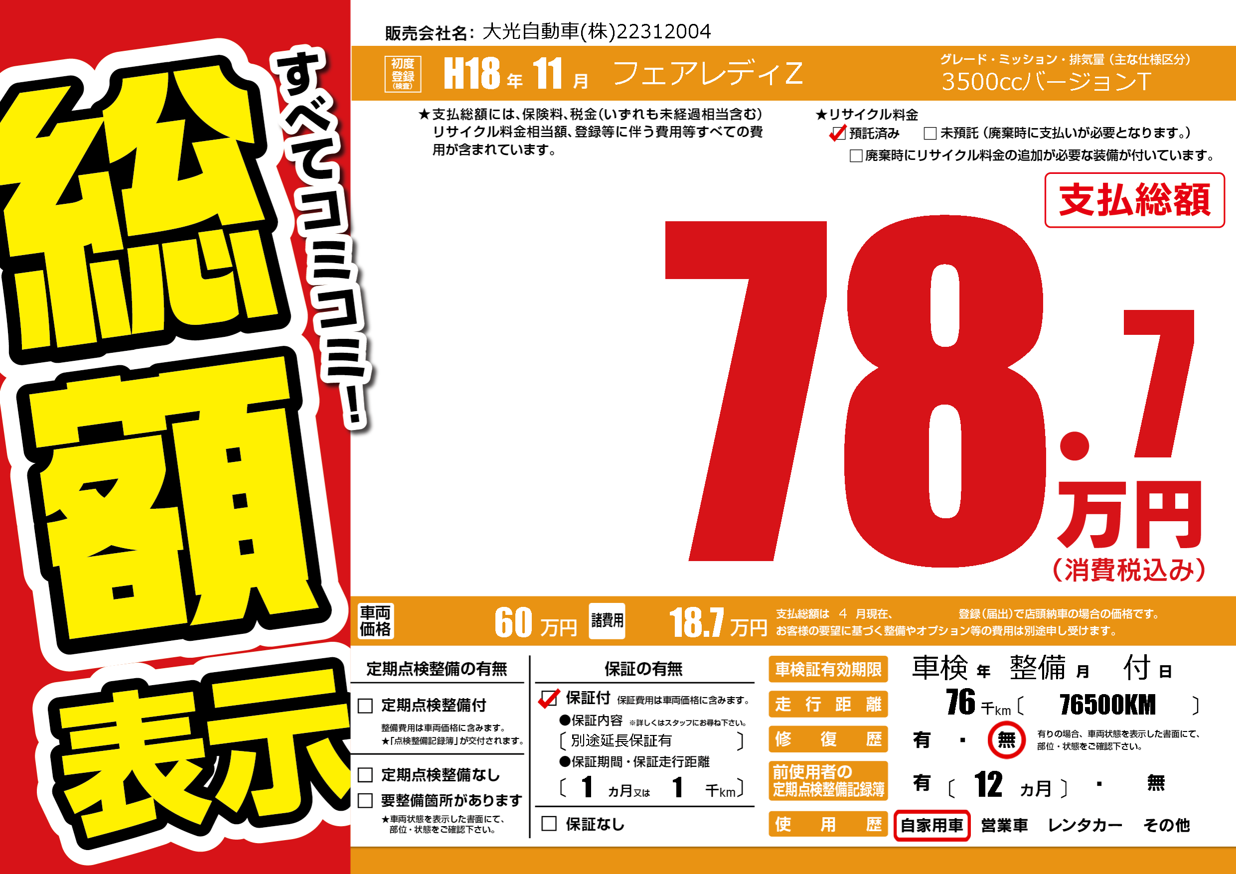 | 車名 | フェアレディZ | グレード ミッション 排気量 |
