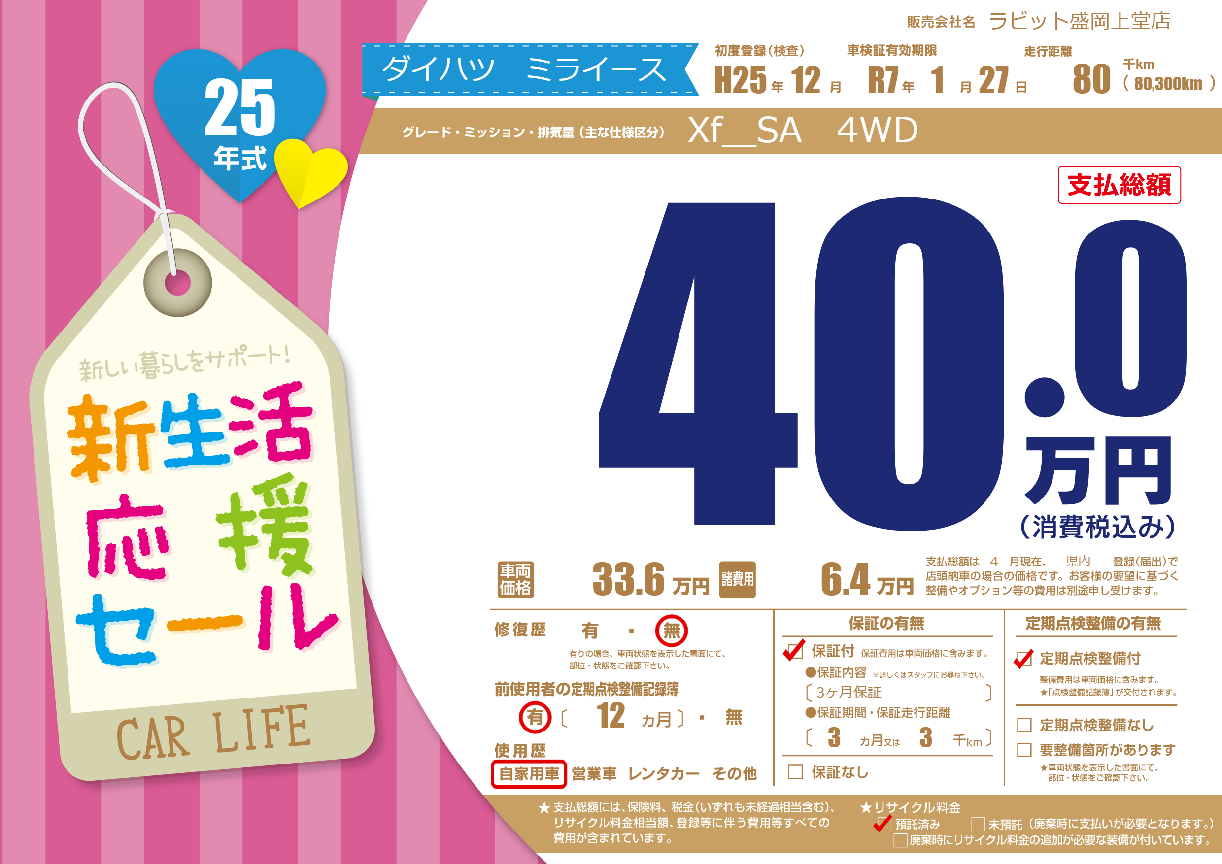 | 走行キロ | 8万km | 初年度登録 | H25年12月 |