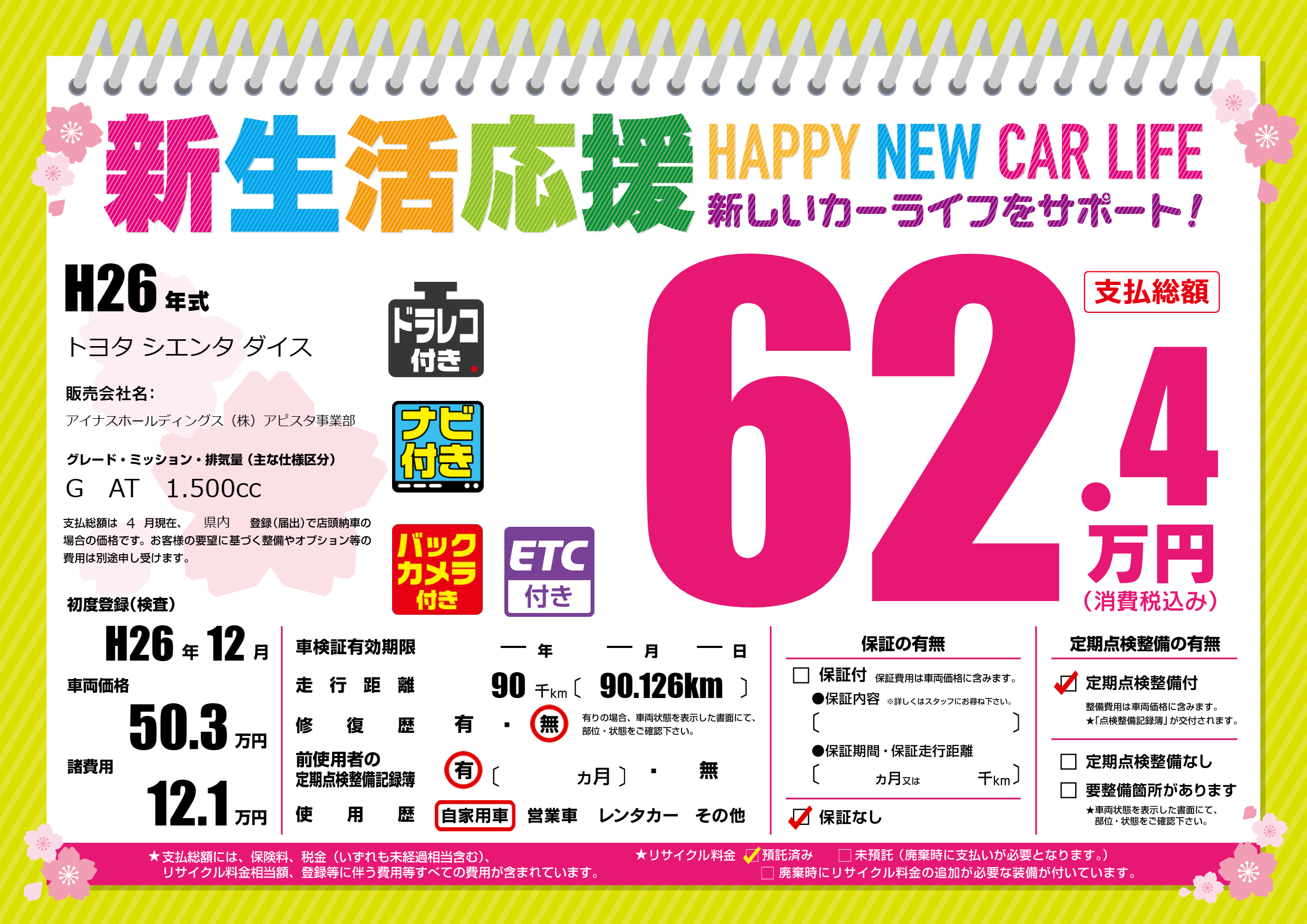 | 車名 | トヨタ シエンタ ダイス | グレード ミッション 排気量 |