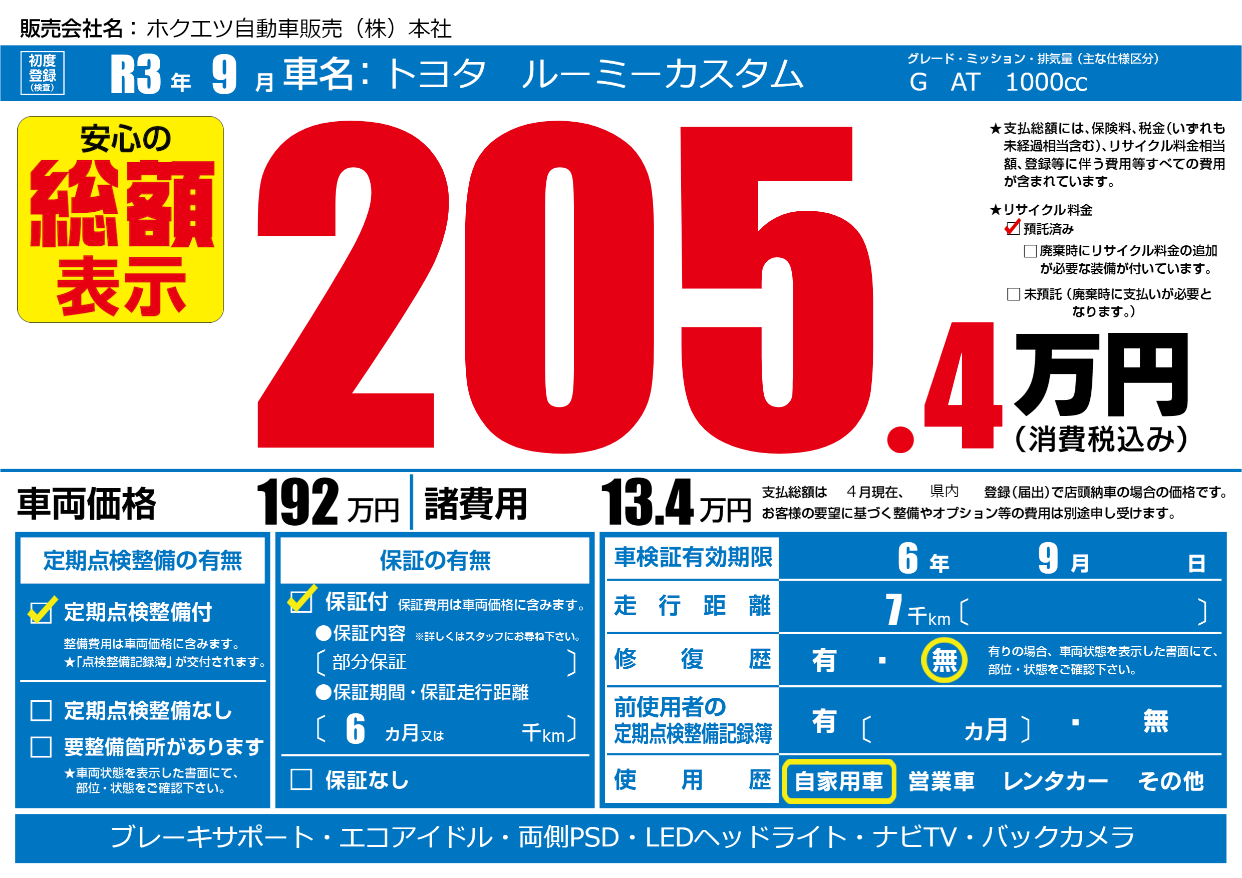 | 走行キロ | 0.7万km | 初年度登録 | R3年9月 |