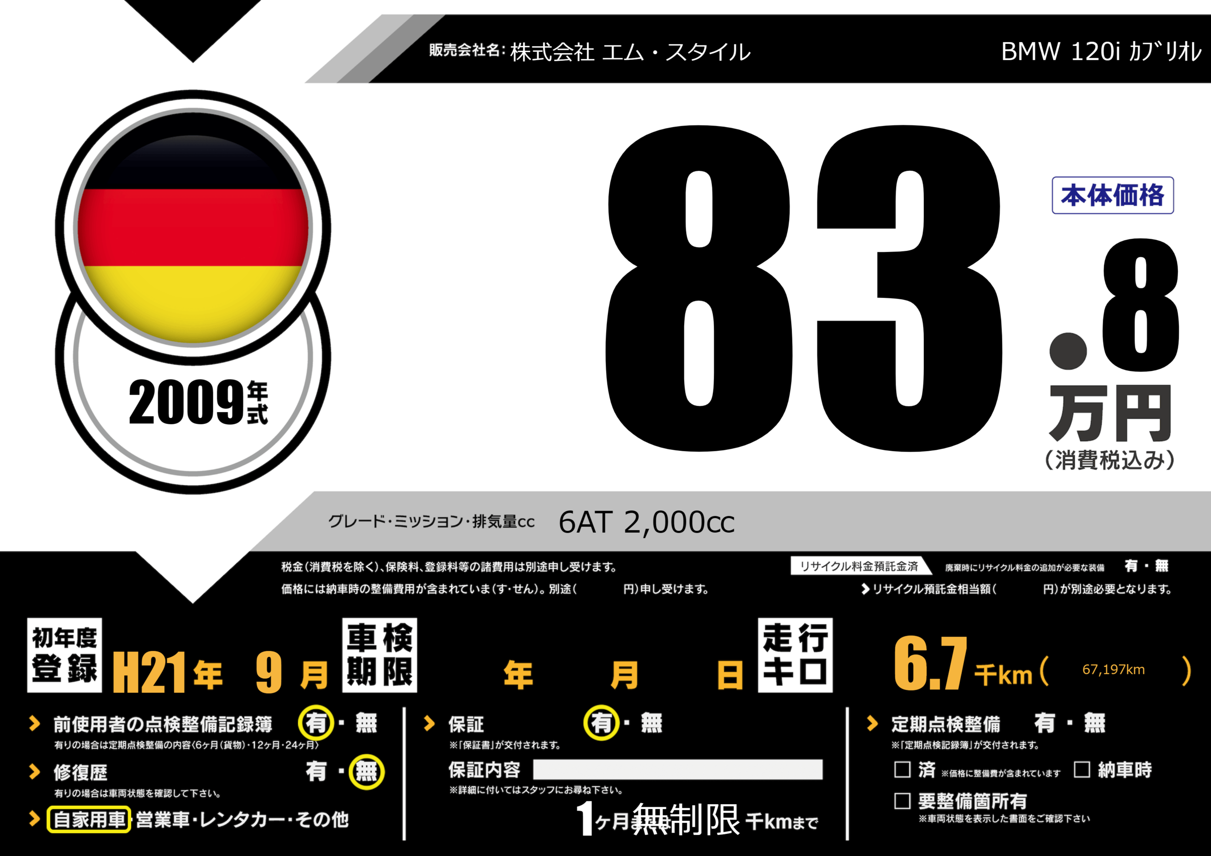| 車名 | BMW 120i カブリオレ | グレード ミッション 排気量 |