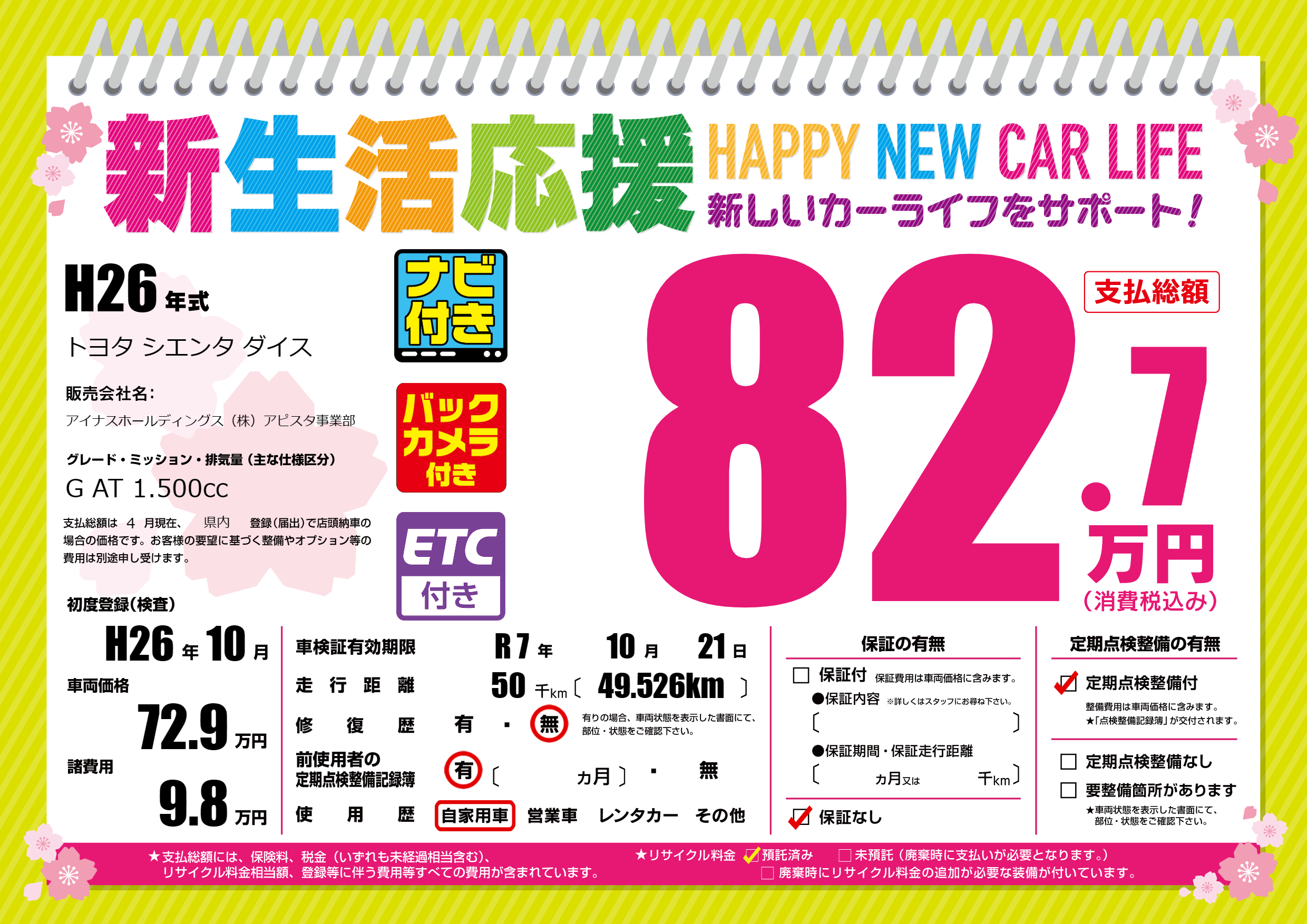 | 車名 | トヨタ シエンタ ダイス | グレード ミッション 排気量 |