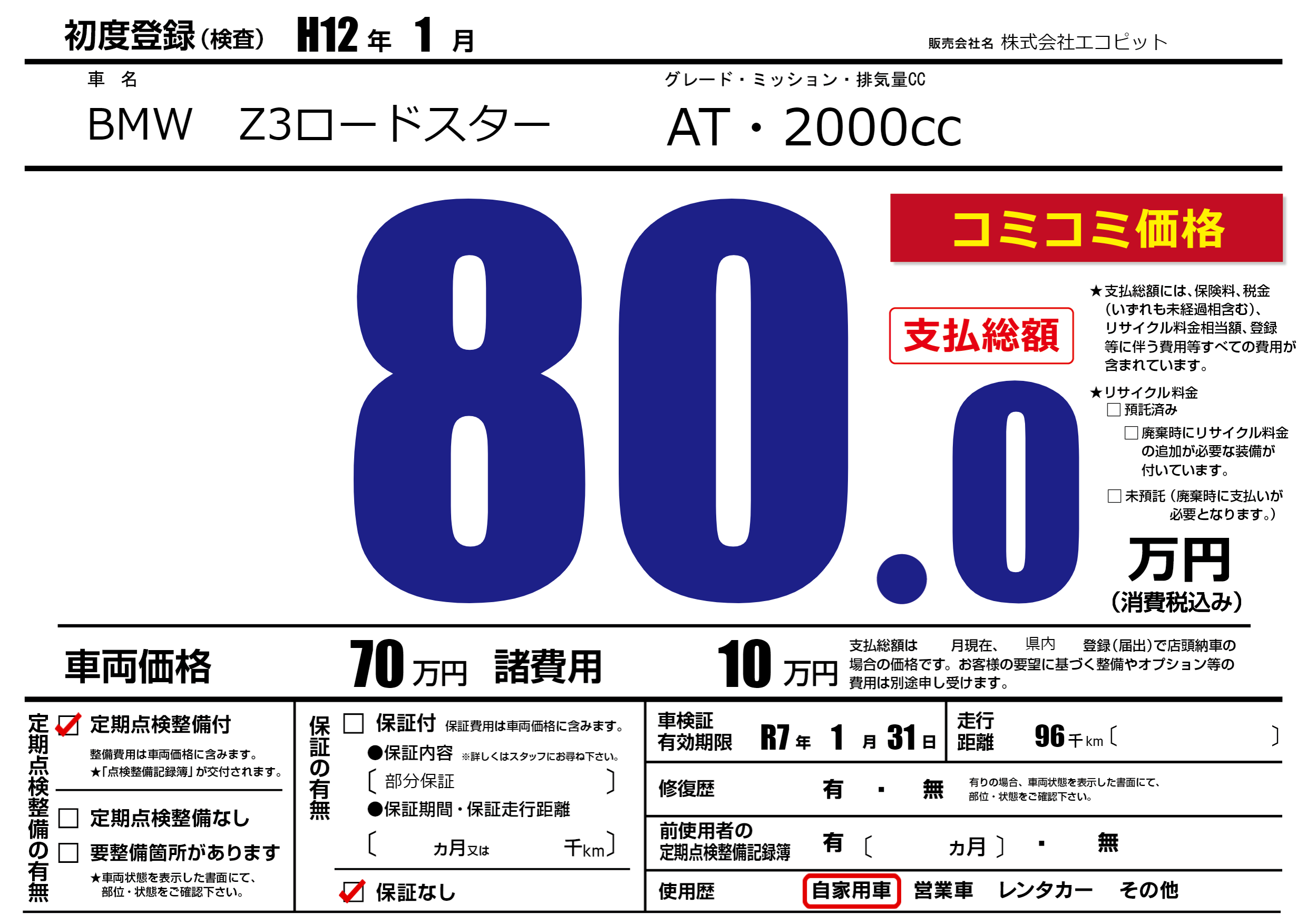 | 車名 | BMW Z3ロードスター | グレード ミッション 排気量 |