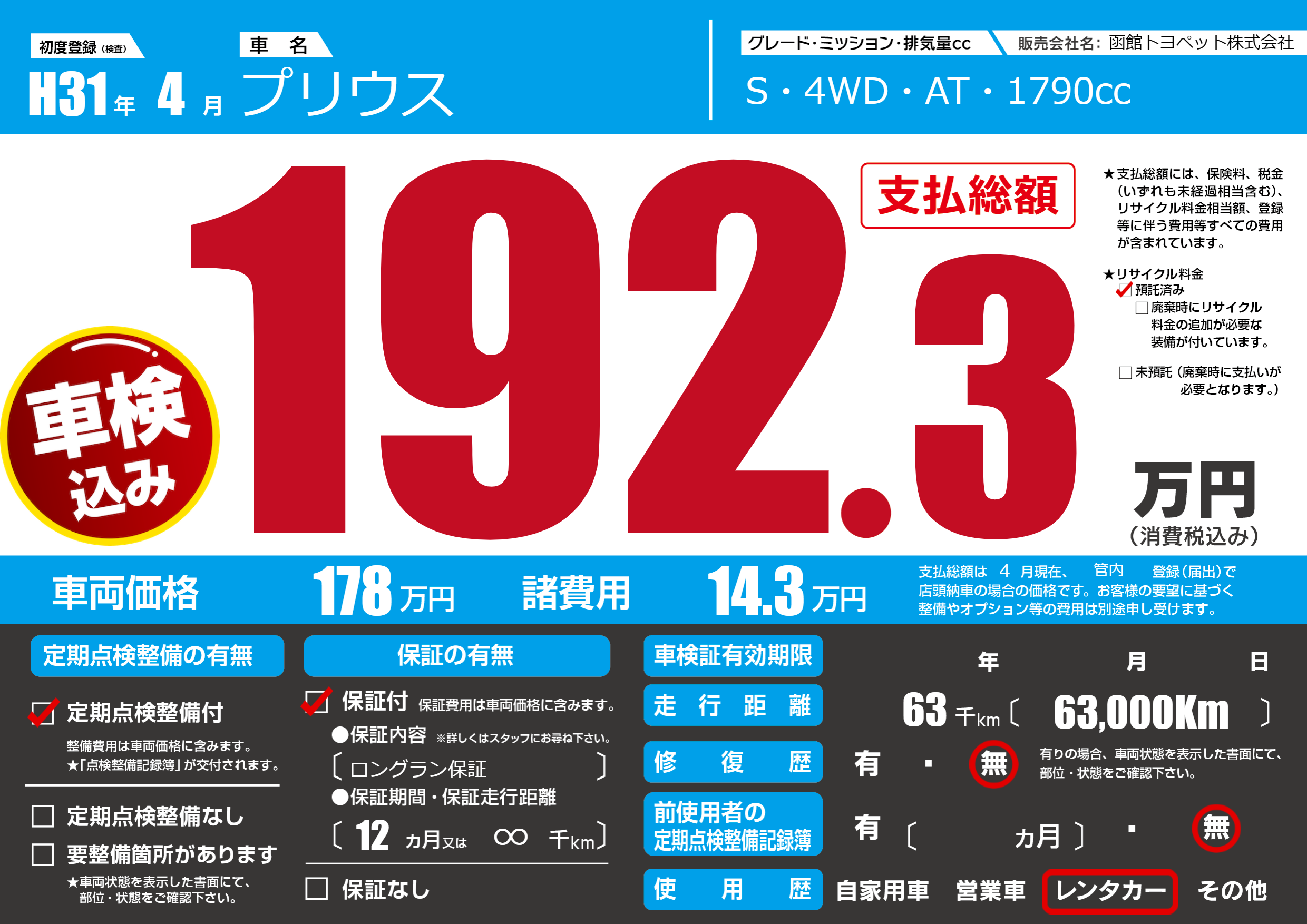 | 走行キロ | 6.3万km | 初年度登録 | H31年4月 |
