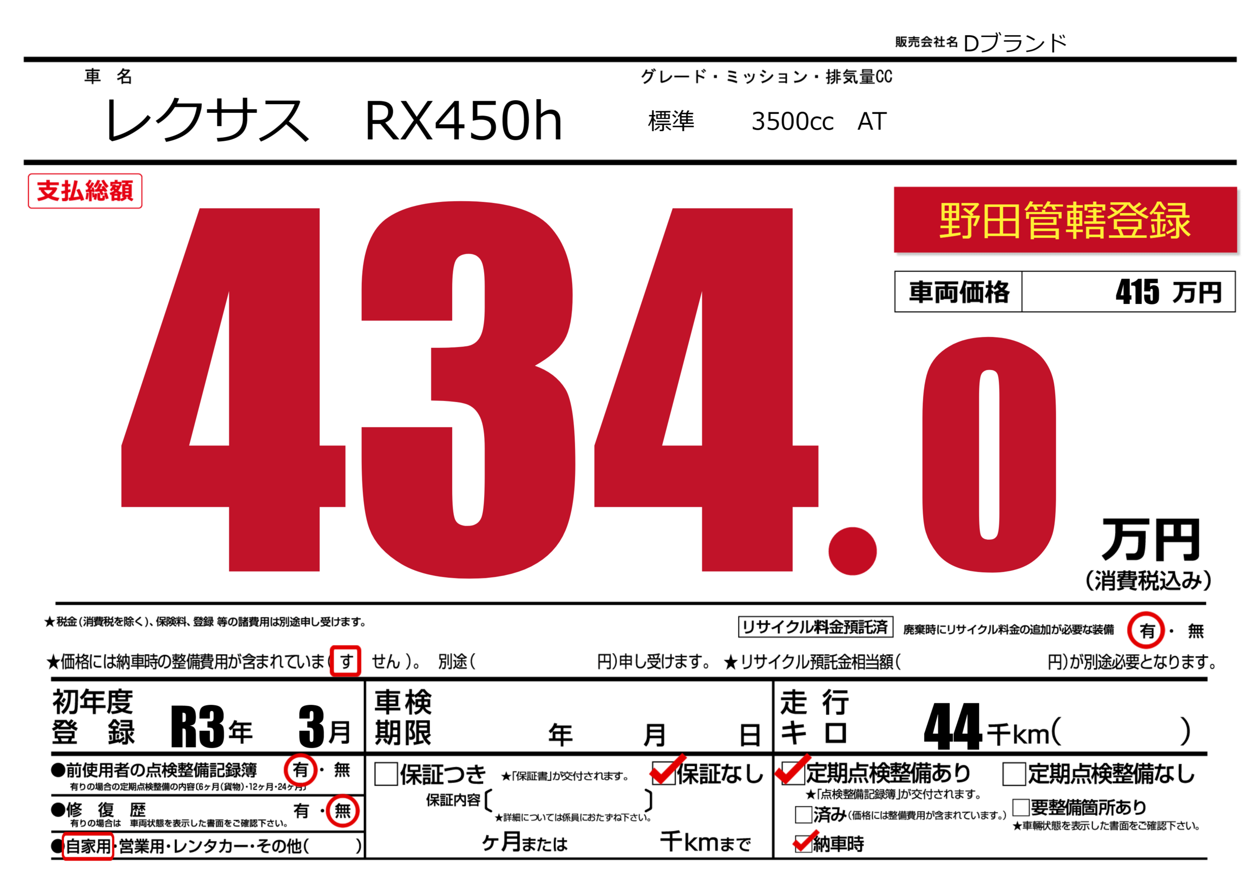 | 車名 | レクサス RX450h | グレード ミッション 排気量 |