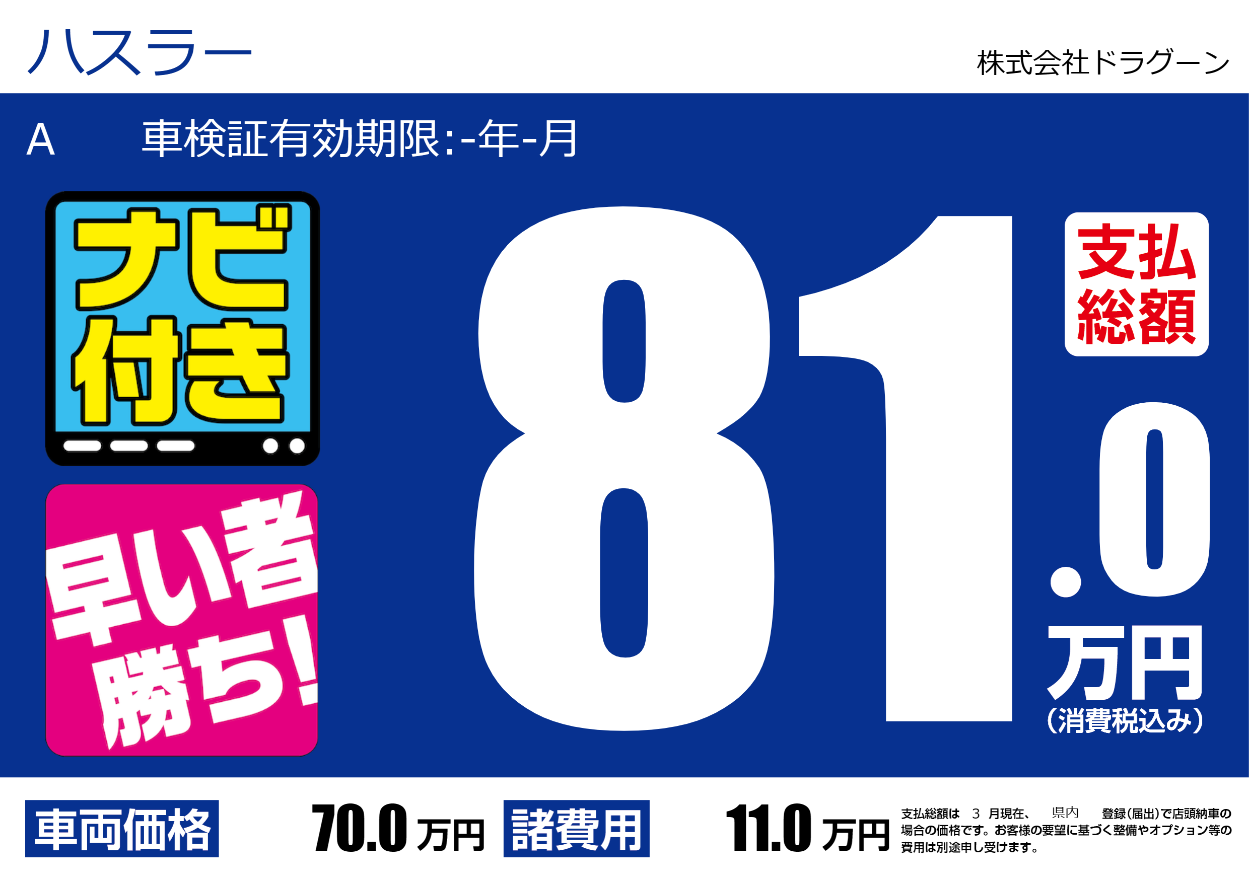 | 車名 | ハスラー | グレード ミッション 排気量 |
