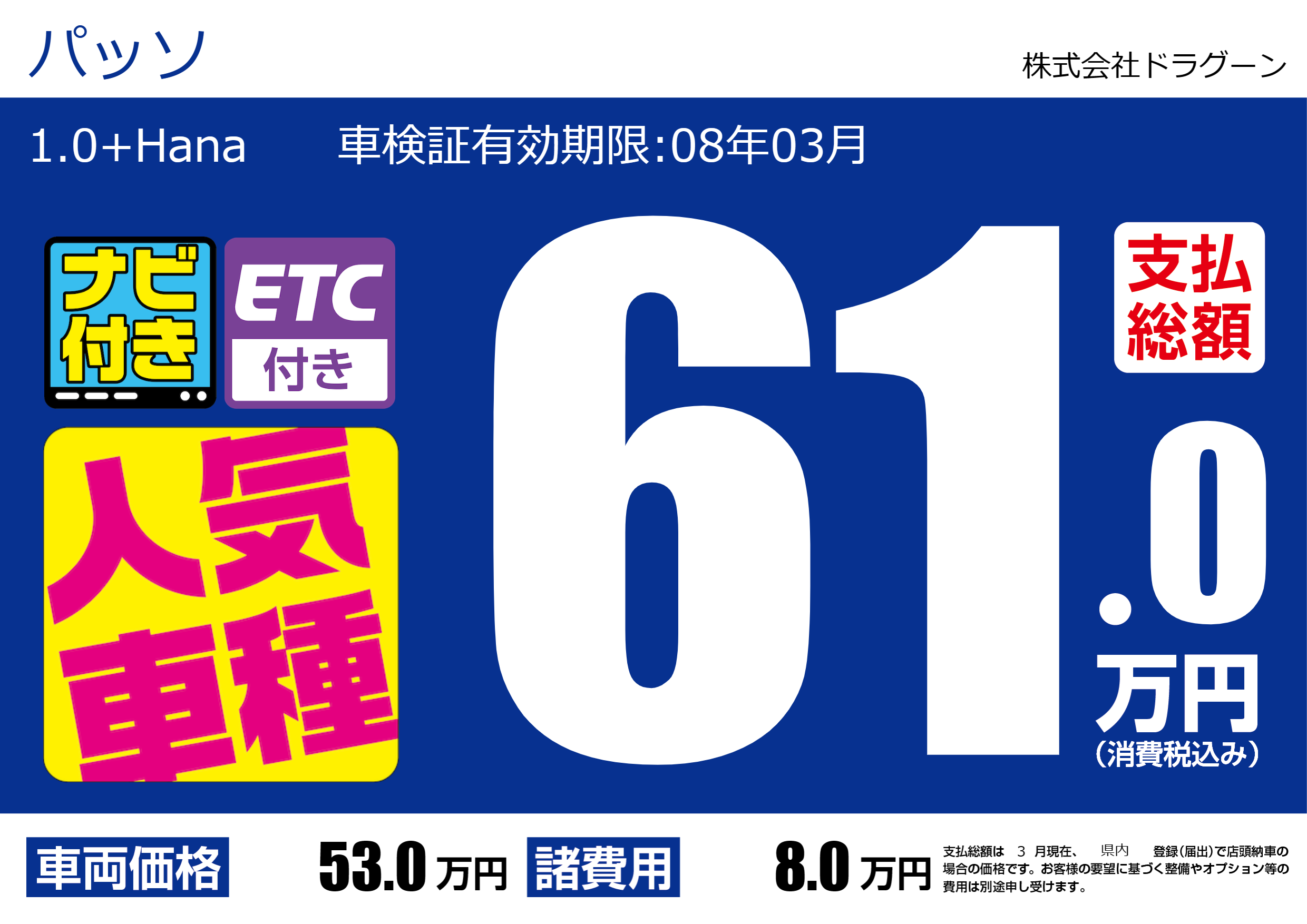 | 車名 | パッソ | グレード ミッション 排気量 |