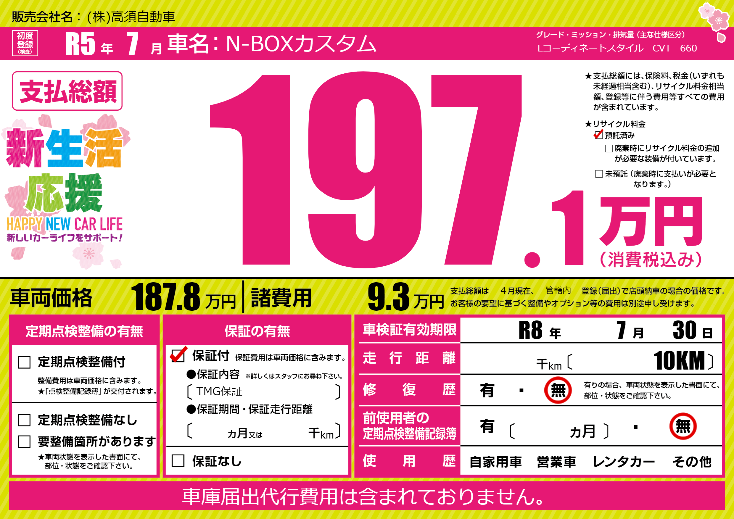 保証付き 保証内容(TMG保証) ---ヶ月または()千kmまで |