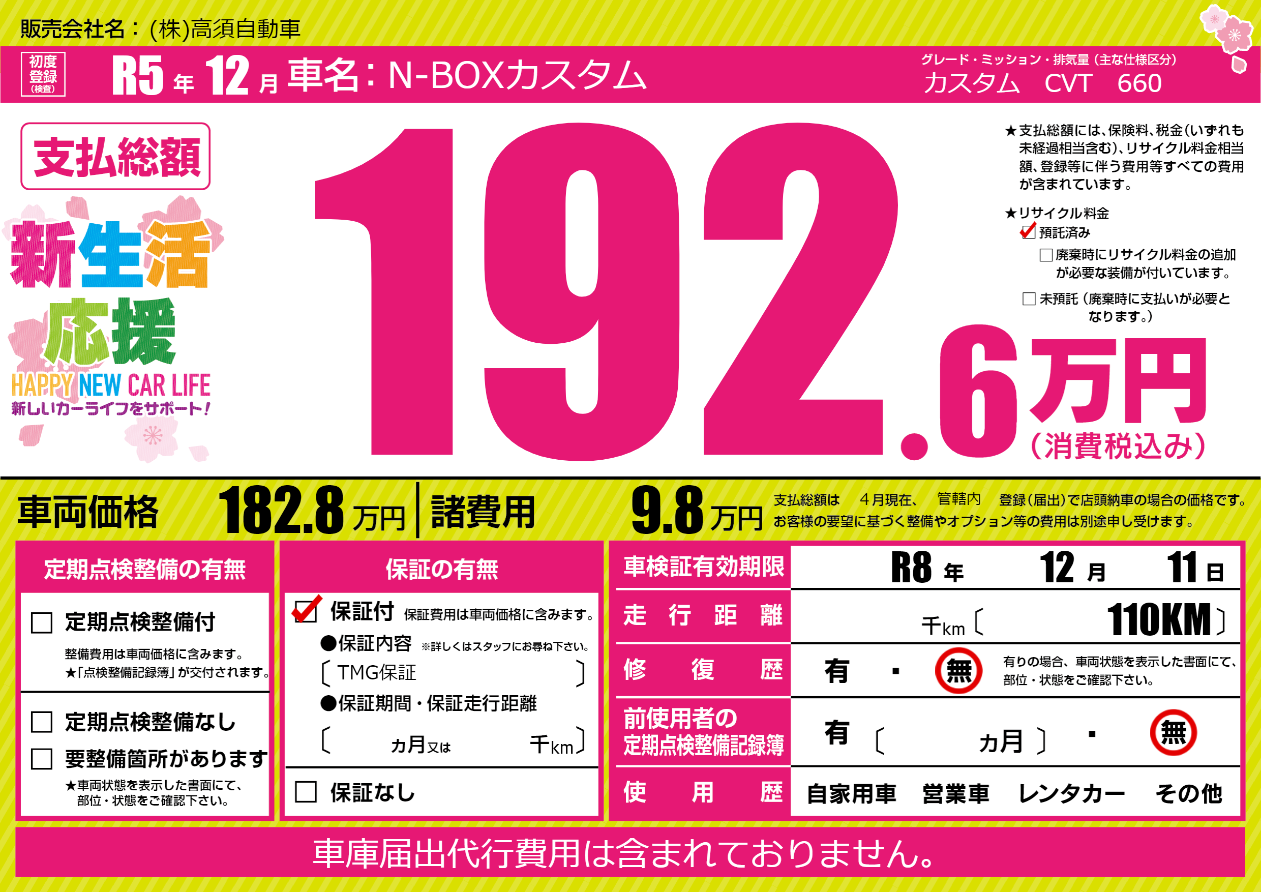 保証付き 保証内容(TMG保証) ---ヶ月または()千kmまで |