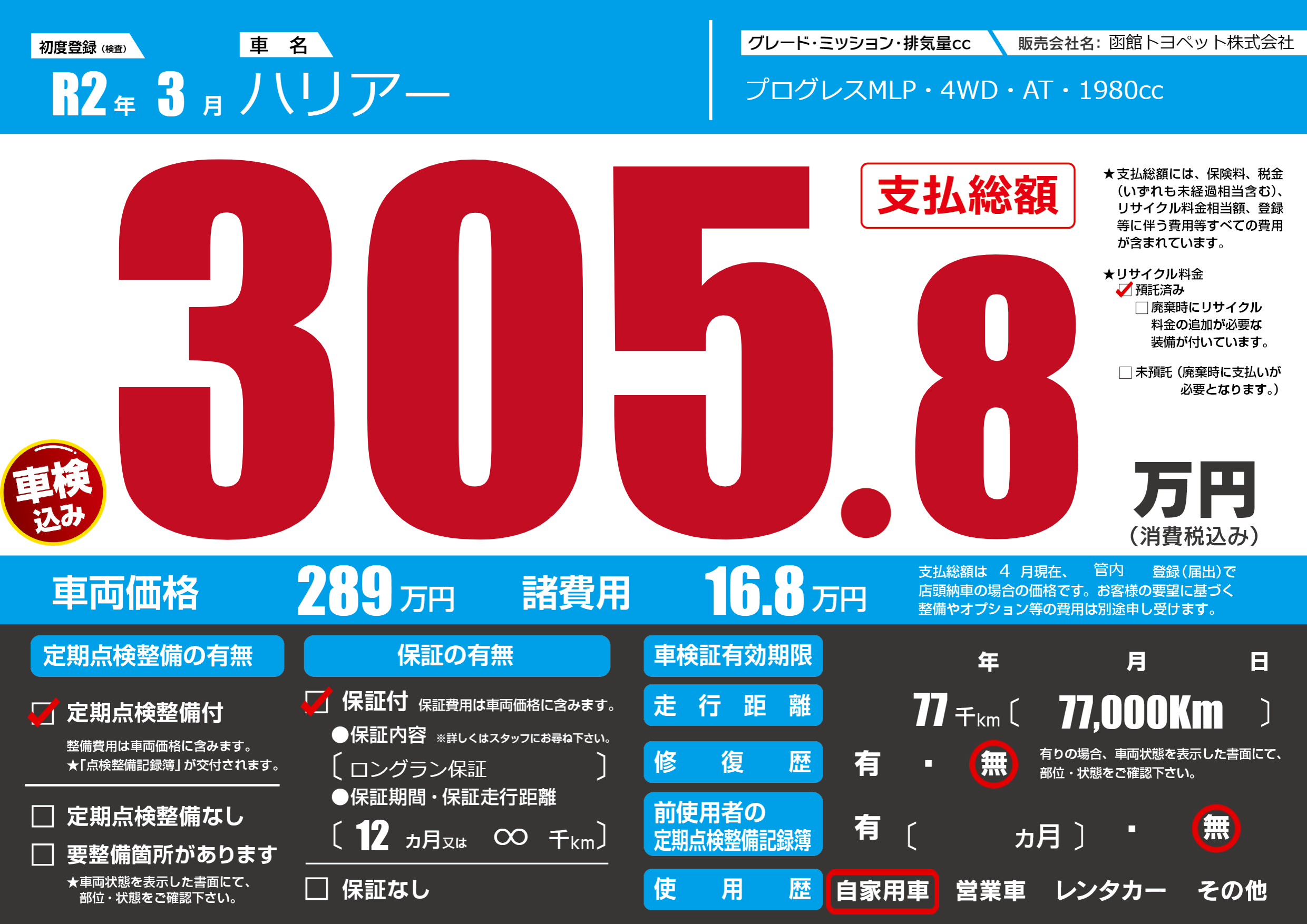 | 走行キロ | 7.7万km | 初年度登録 | R2年3月 |