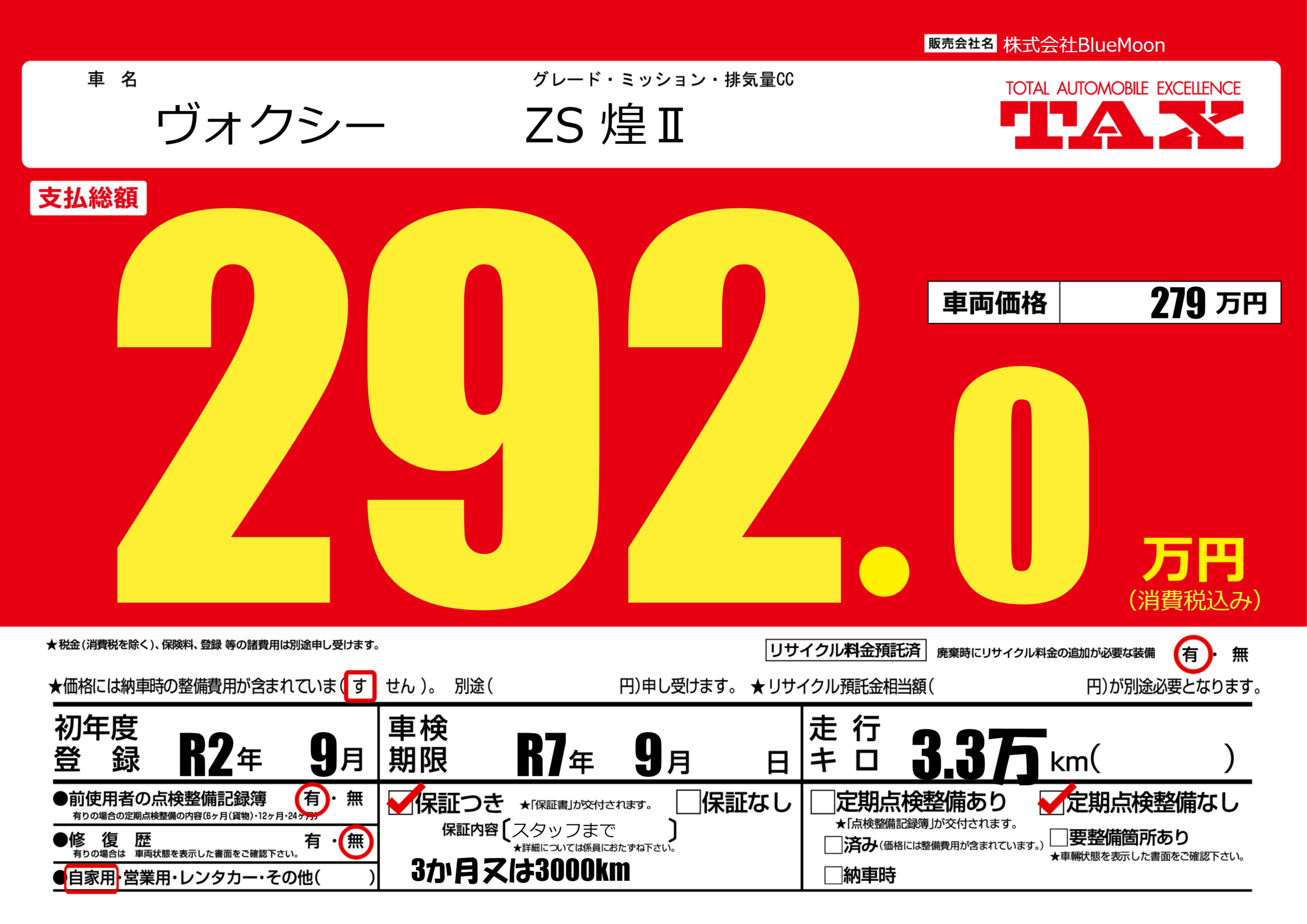 | 走行キロ | 0.3万km | 初年度登録 | R2年9月 |