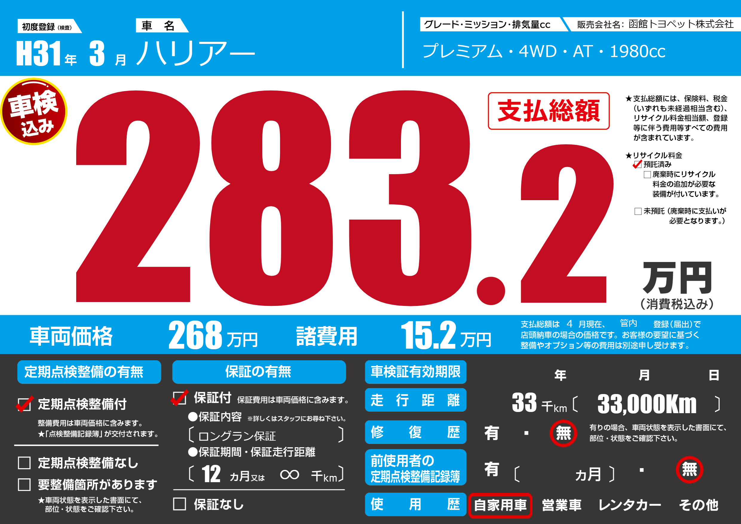 | 走行キロ | 3.3万km | 初年度登録 | H31年3月 |