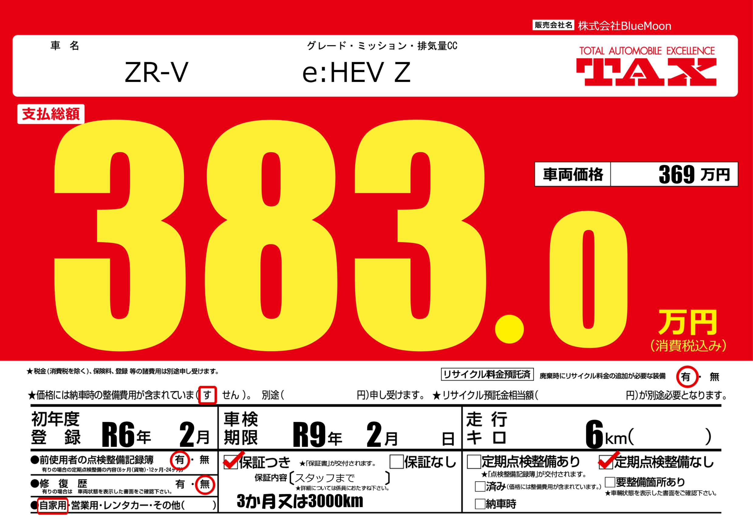 | 車名 | ZR-V | グレード ミッション 排気量 |