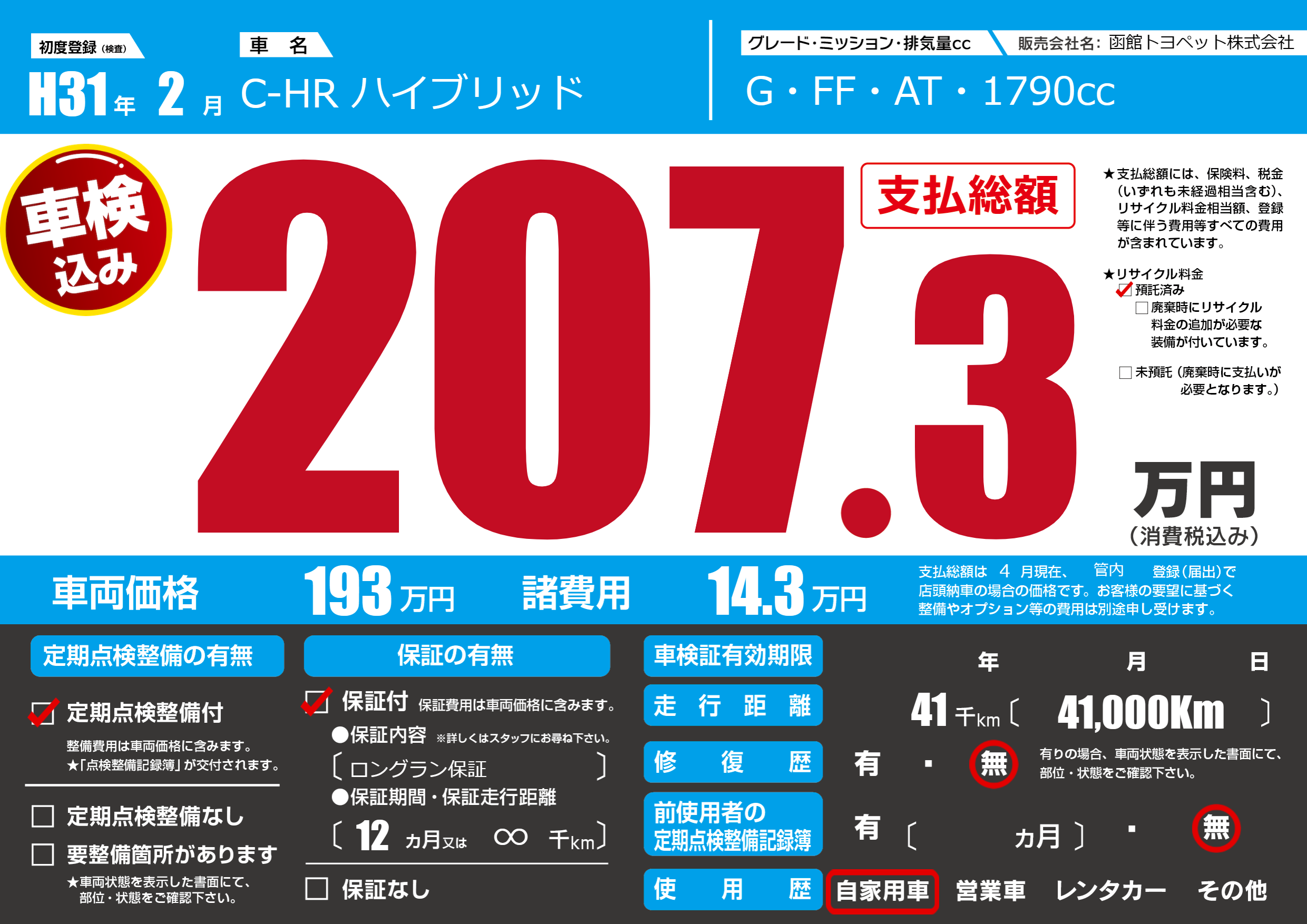 | 車名 | C-HR ハイブリッド | グレード ミッション 排気量 |