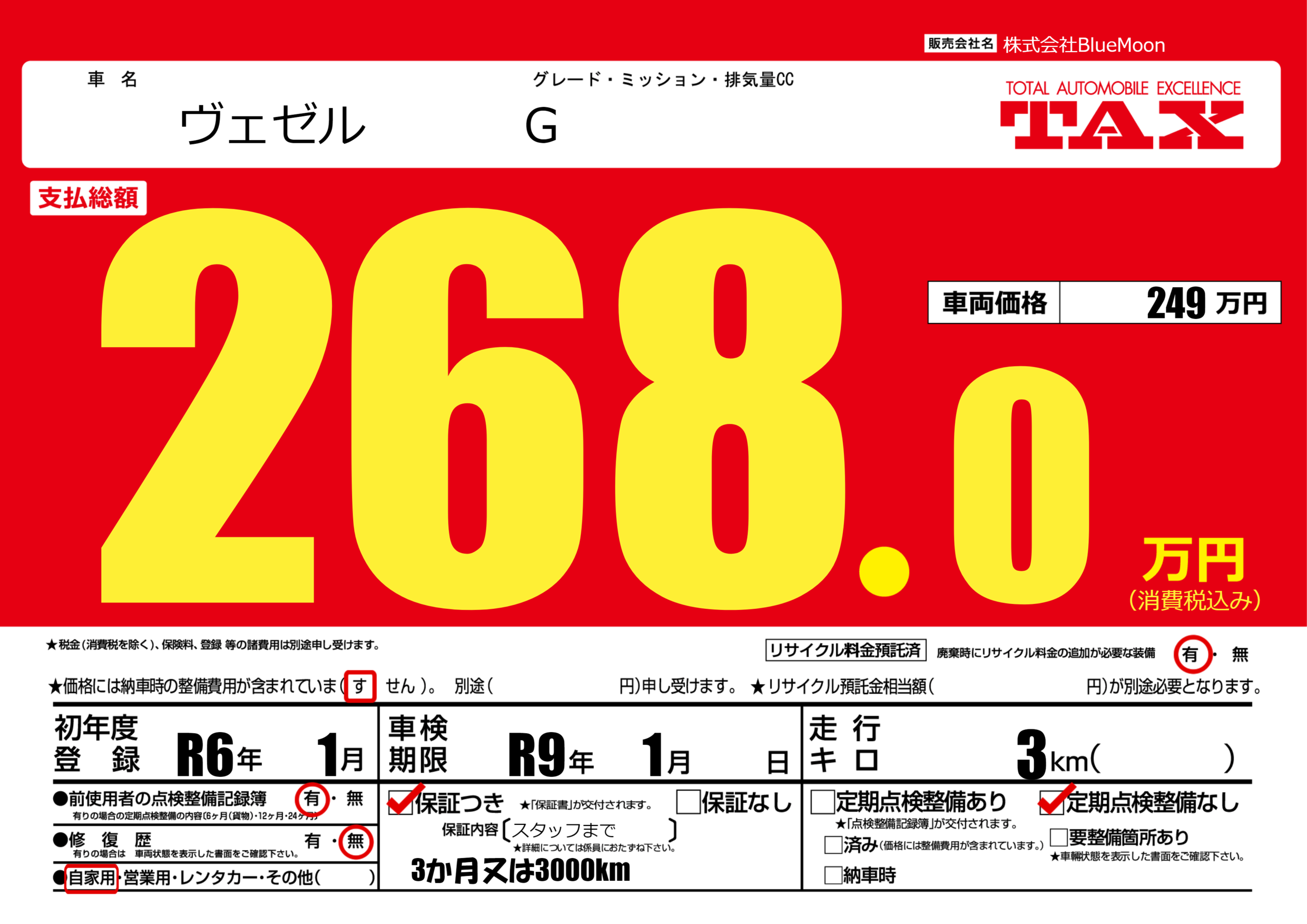 | 走行キロ | 0.3万km | 初年度登録 | R6年1月 |