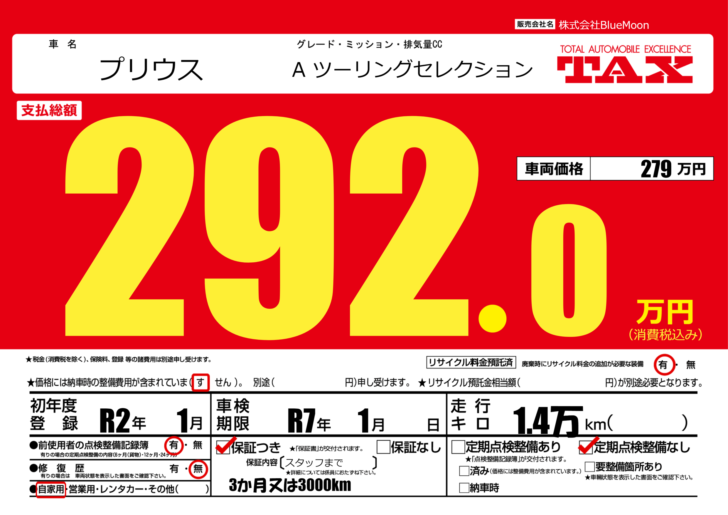 保証付き 保証内容(スタッフまで) ---ヶ月または()千kmまで |