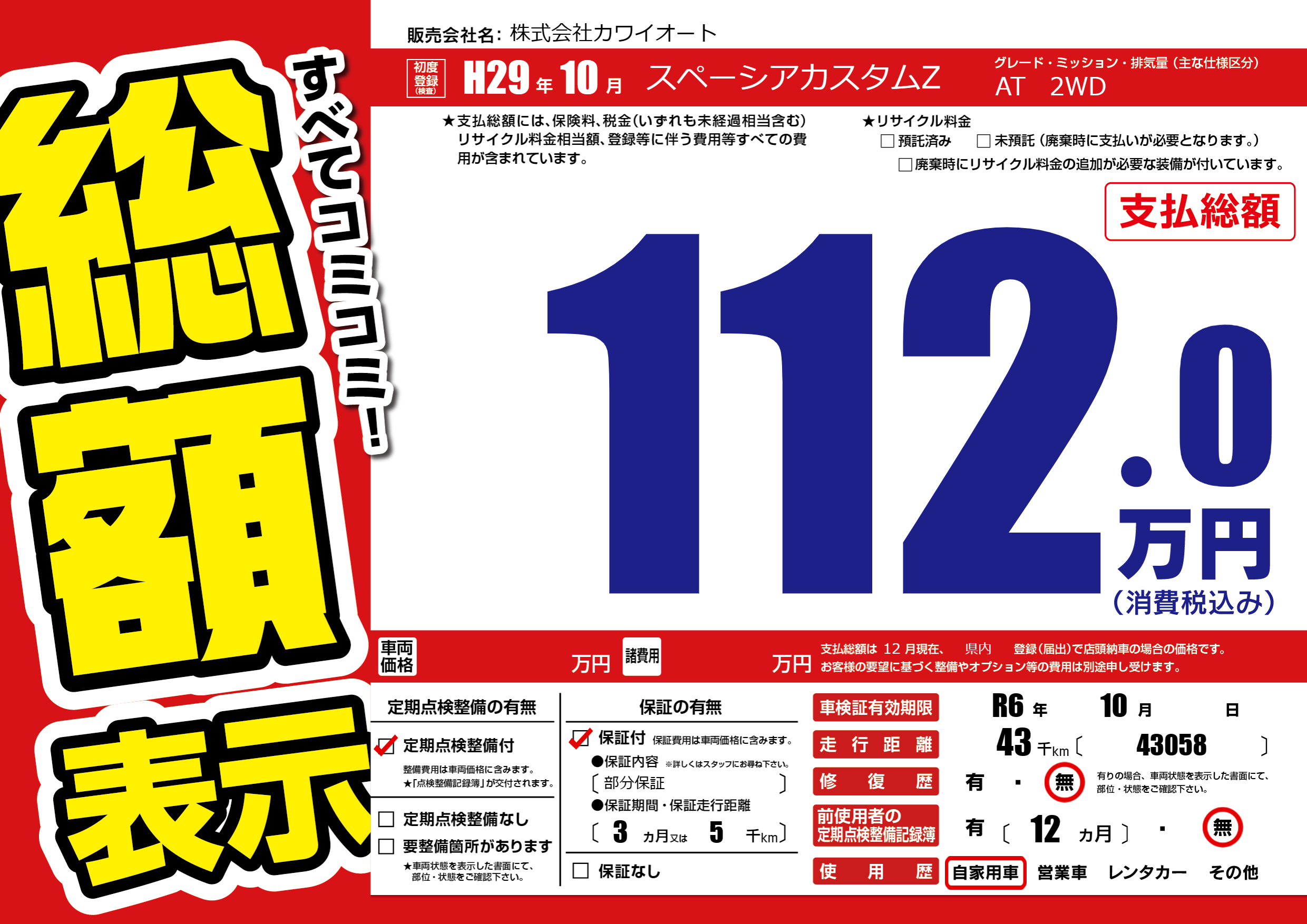 | 車名 | スペーシアカスタムZ | グレード ミッション 排気量 |