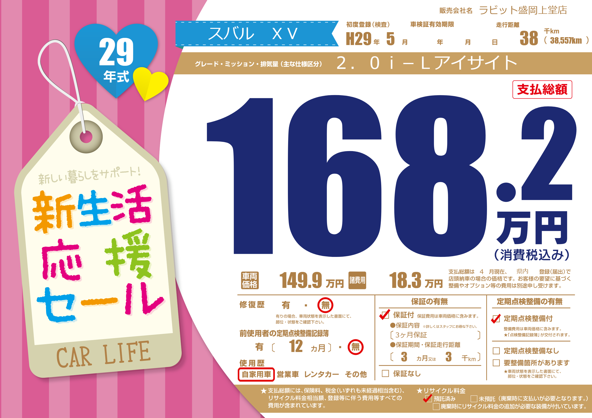 | 走行キロ | 3.8万km | 初年度登録 | H29年5月 |